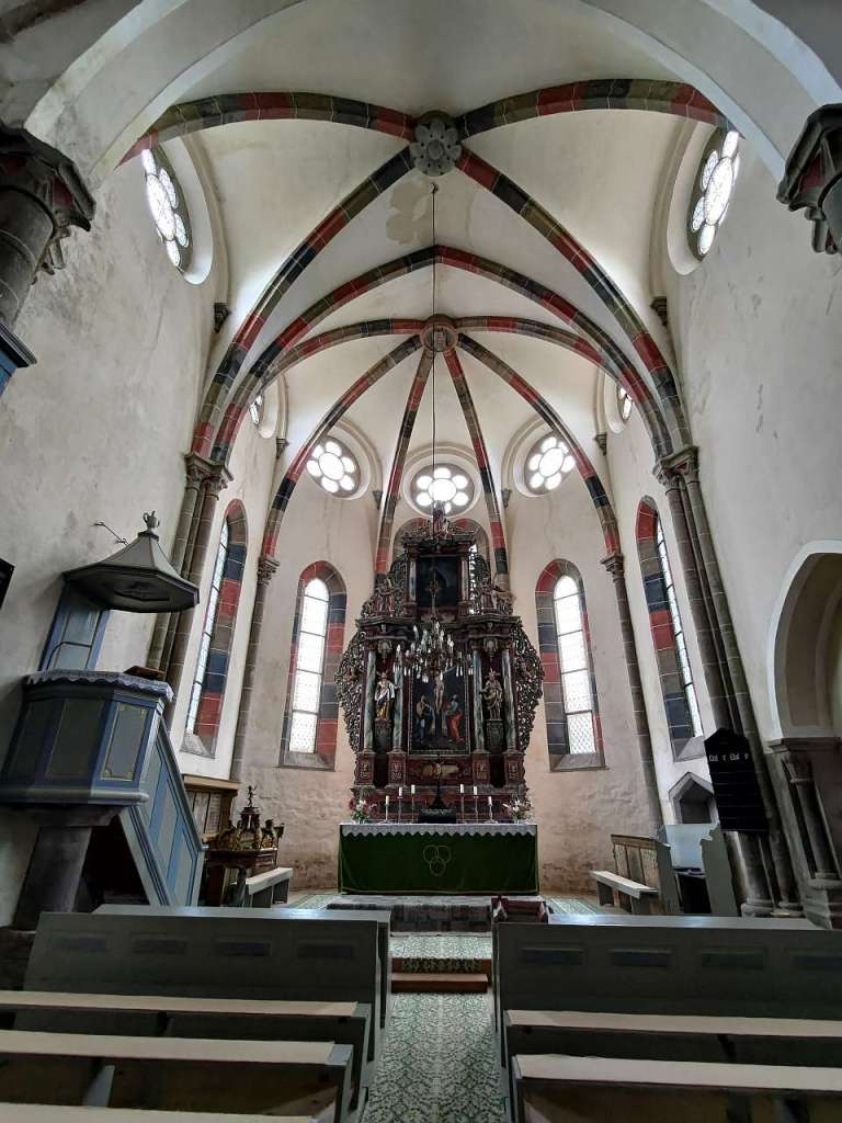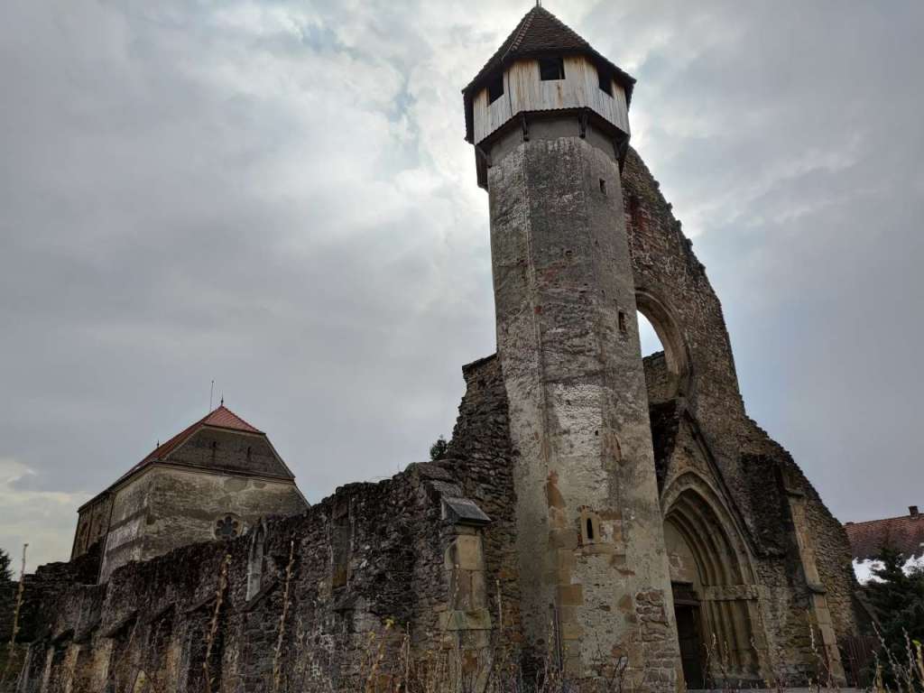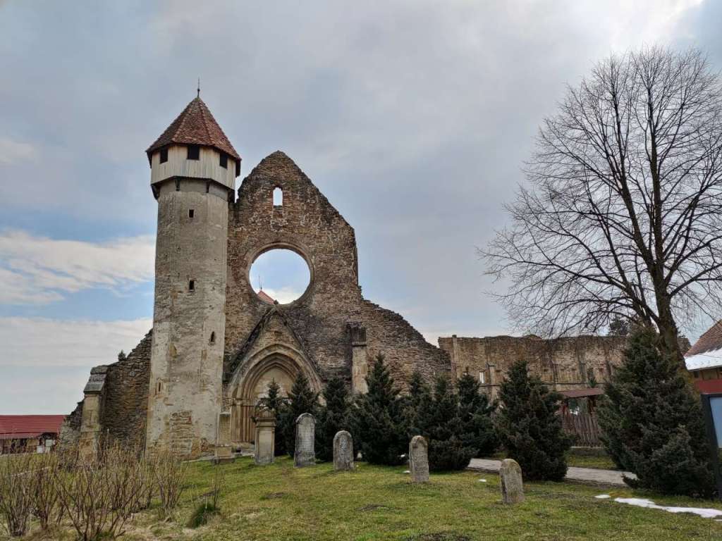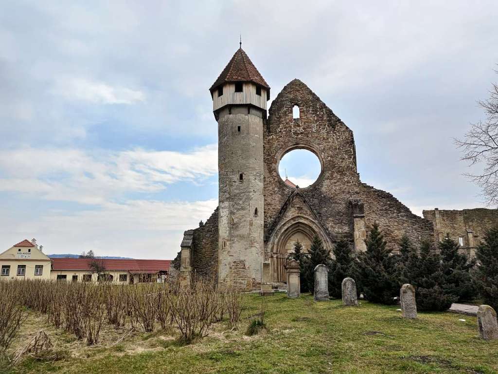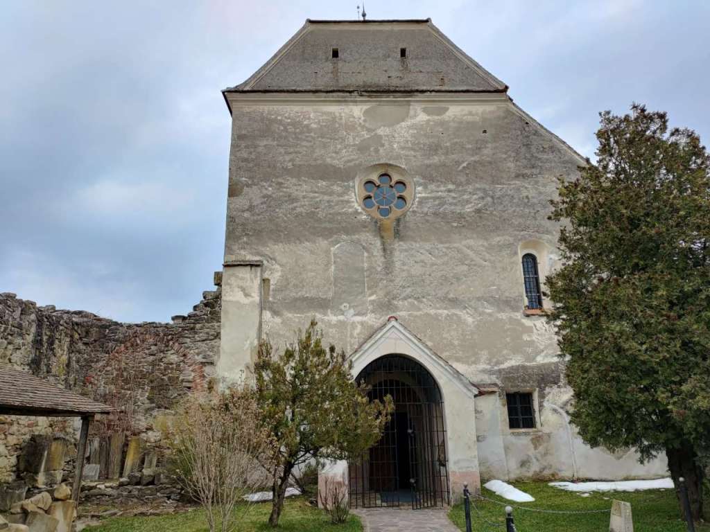 Singura în picioare și complet funcțională este biserica, restaurată și folosită de comunitatea evanghelică. Impresionantă și ea, tot în stil gotic, cu acele ferestre-rozetă mari în partea superioară…