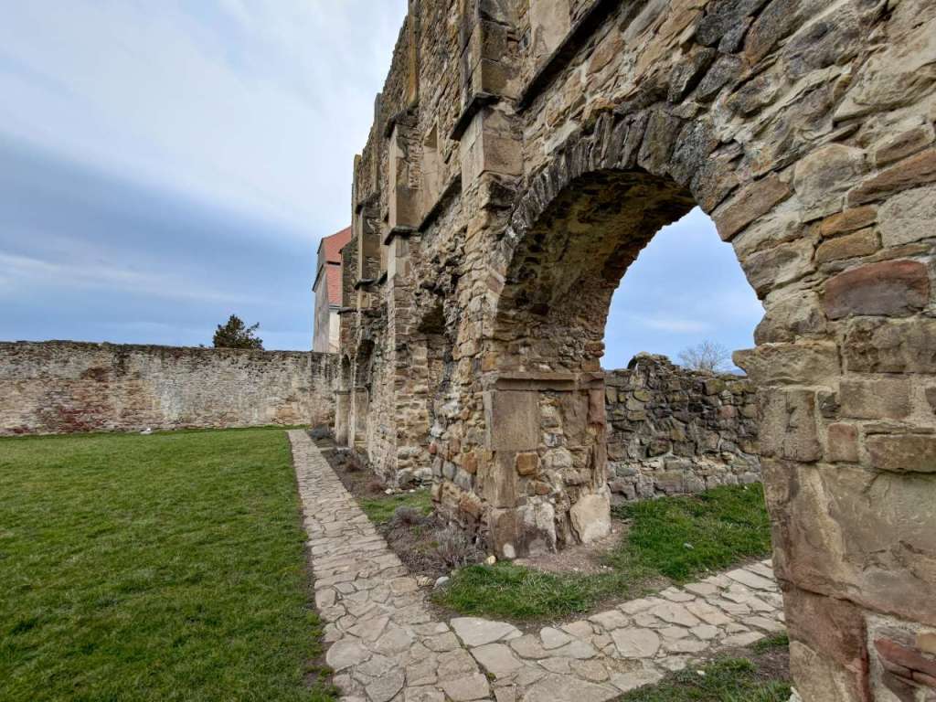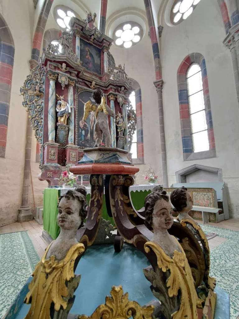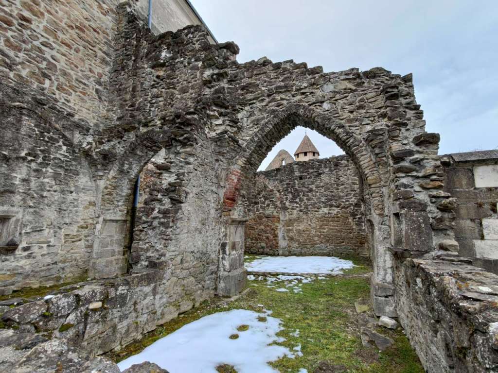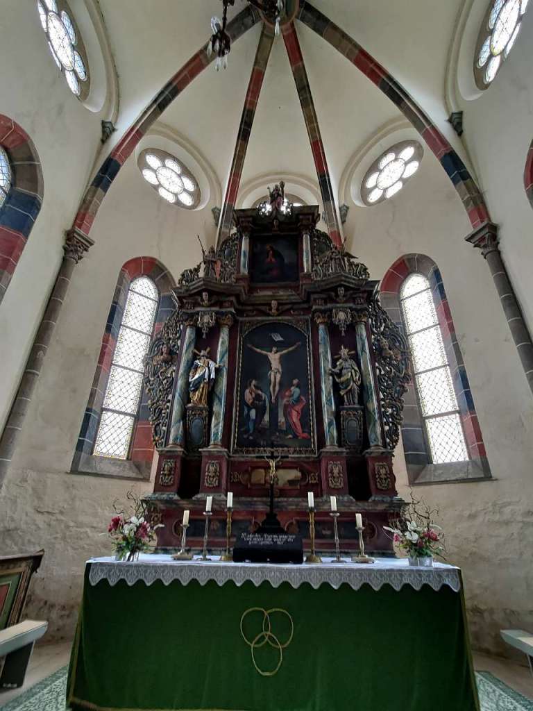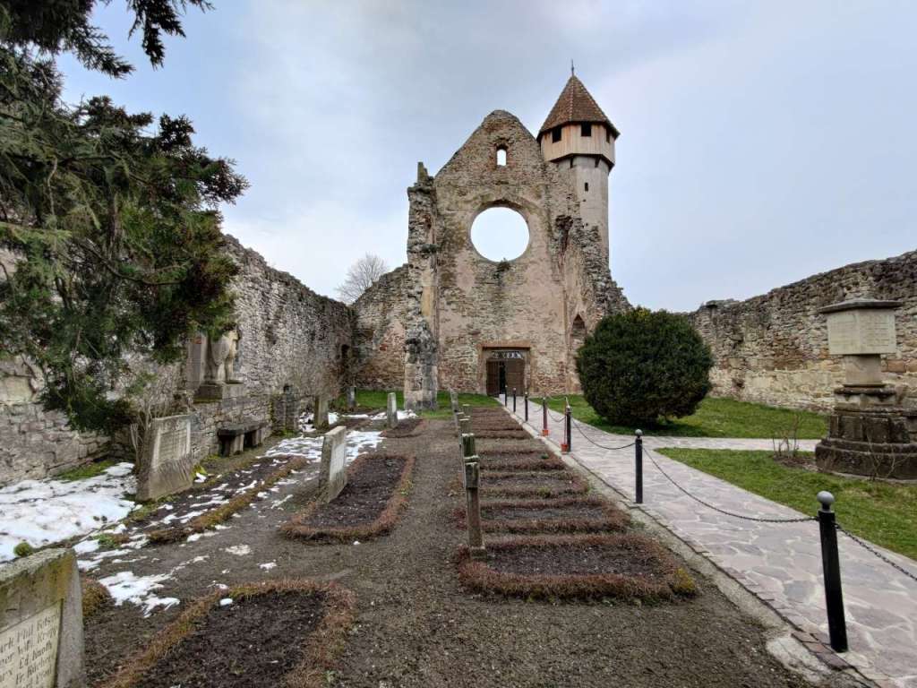 Singura în picioare și complet funcțională este biserica, restaurată și folosită de comunitatea evanghelică. Impresionantă și ea, tot în stil gotic, cu acele ferestre-rozetă mari în partea superioară…