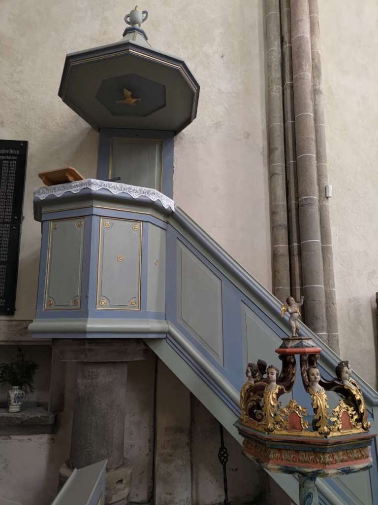 La interior am admirat altarul baroc, orga mecanică datată 1777 dar și micuța ușă a sacristiei, frumos decorată.