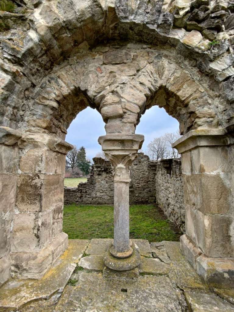 După ce am ieșit din bisericuță am dat roată ruinelor clădirii în care era biblioteca și dormitorul comun și am admirat ce se mai vede acum – zidurile încă înalte, capiteluri, ferestre…