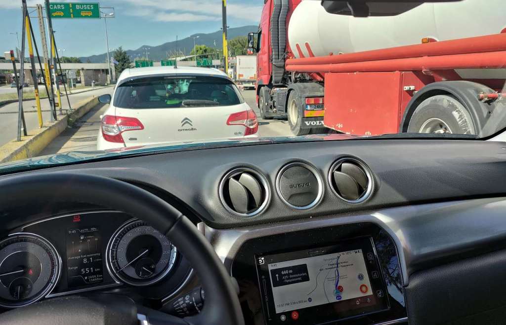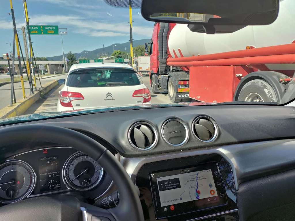 De unde s-au format două rânduri de autoturisme și unul cu tiruri. Practic, am stat 1 oră și 10 minute până am trecut vama. Ne-au fost verificate pașapoartele, adeverințele de vaccinare dar și declarația PLF completată pe internet și primită pe e-mail în noaptea plecării, chiar cu atenție și minuțiozitate de către vameșul grec.