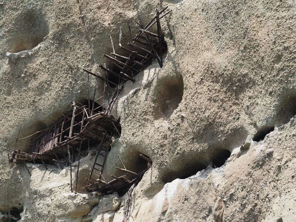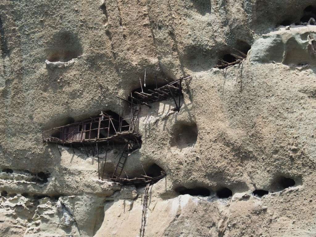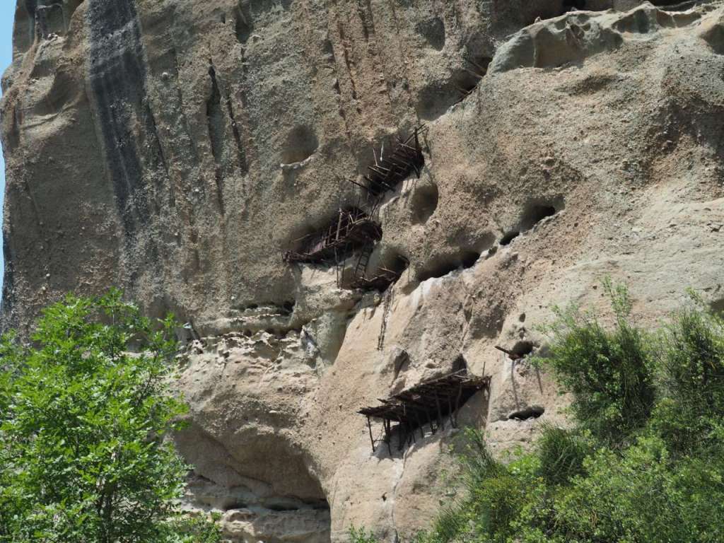 Mai sunt încă vizibile schelele din lemn folosite pentru accesul în cavernele și peșterile din stâncă. Acum doar păsările cerului își mai au culcușul acolo…