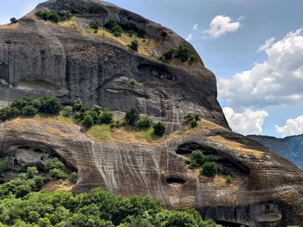 Pe stânca Pyxari se văd vechile peșteri în care trăiau călugării, pe care le-au părăsit acum 2 secole… pesemne ca să se mute și să lucreze la mănăstirile clădite sus pe stâncăraie, unele ruină acum, distruse de timpuri, de turci sau de naziști.