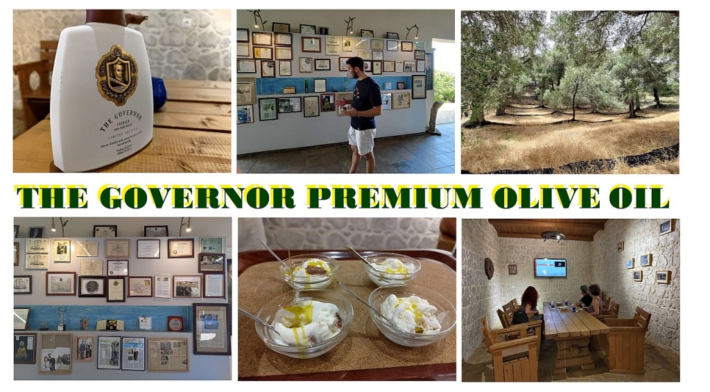 … după cum am spus, ne îndreptam cu mașina către Pelekas, unde eram cazați ca să începem să pregătim bagajele de plecare. În localitatea Agios Mattheos am zărit indicatorul către Governor Olive Oil, una dintre cele mai cunoscute mărci de ulei de măsline ale insulei dar, pe moment, nu am procesat și am trecut mai departe…