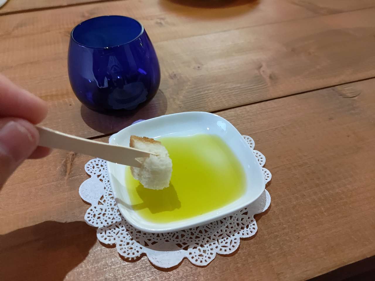 Cu o palmă am ținut paharul, cu cealaltă am acoperit gura acestuia după ce a turnat ulei în el… Ușor am început să frecăm paharul pentru a-l încălzi și, în acest fel, pentru a elibera aromele specifice… apoi am inspirat adânc după ce am descoperit paharul iar prospețimea uleiului de măsline ne-a invadat plămânii și simțurile… ca o boare de primăvară…