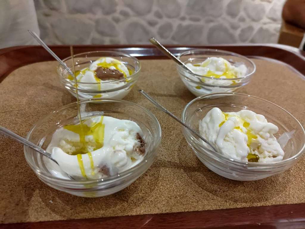 …. pentru ca, cireașa de pe tort, să ne delectăm cu o porție bună de înghețată asezonată cu puțin ulei de măsline. Explozie de gusturi în cerul gurii… nemaipomenită asociere… cum nu mi-aș fi închipuit vreodată…