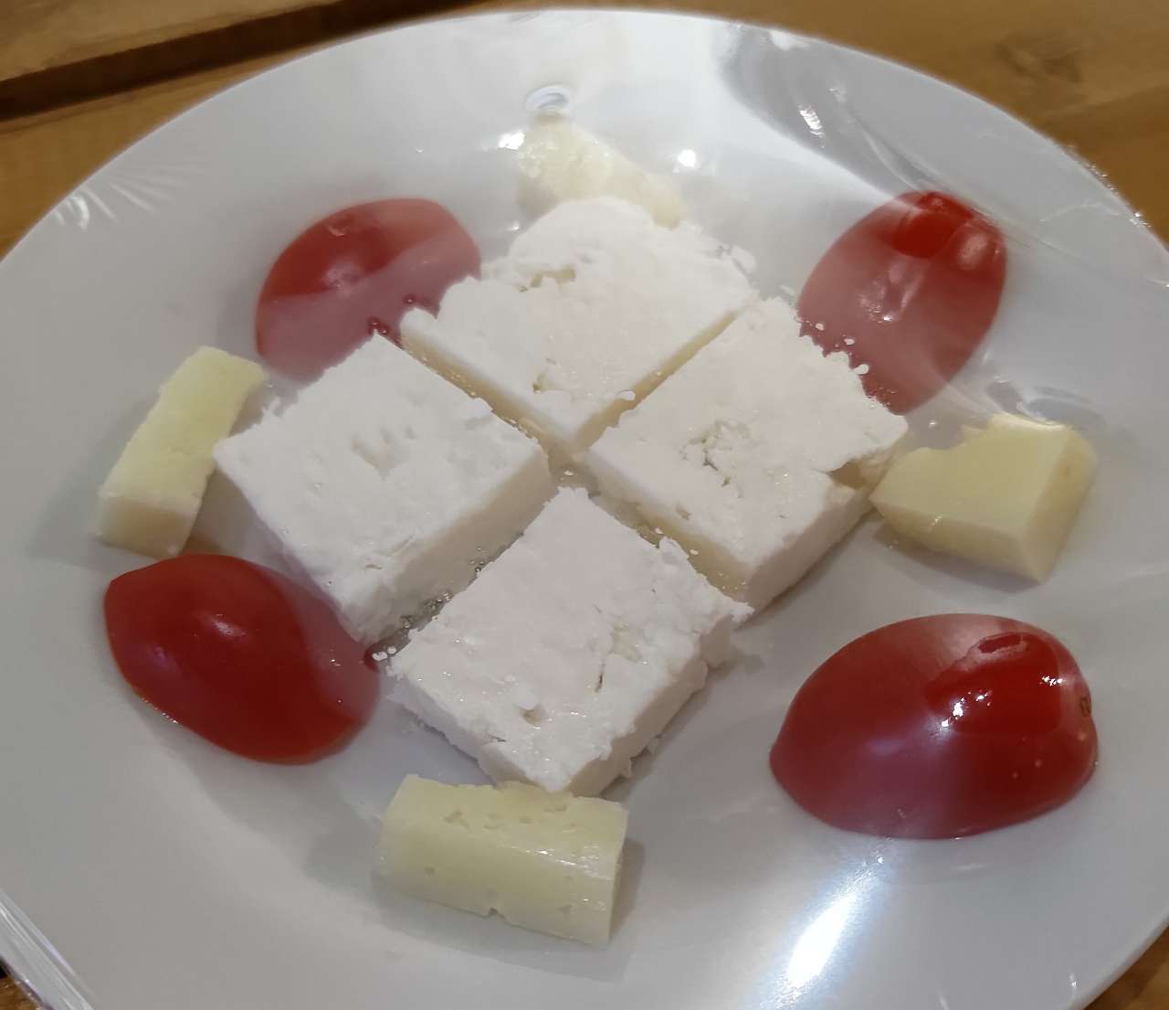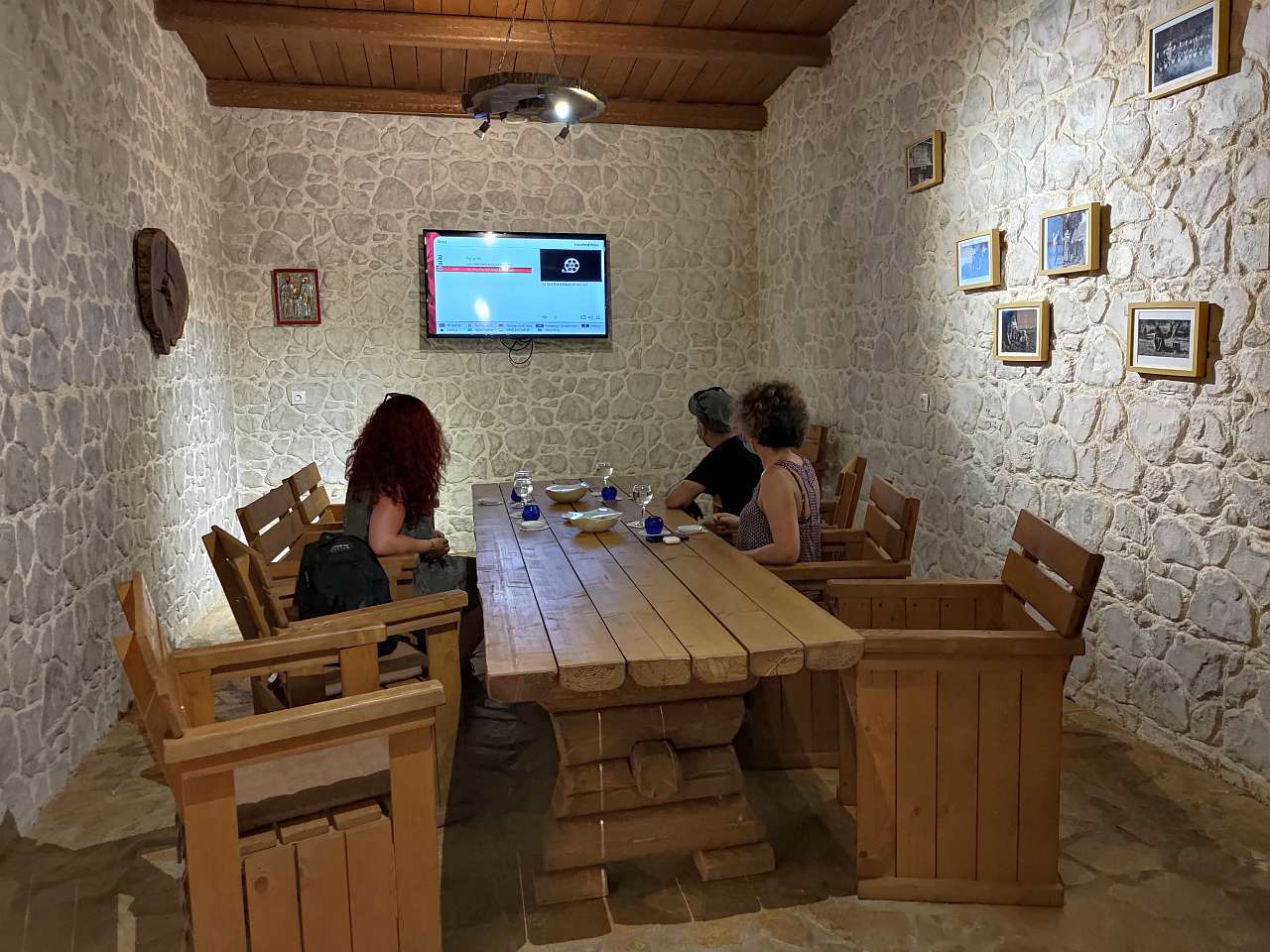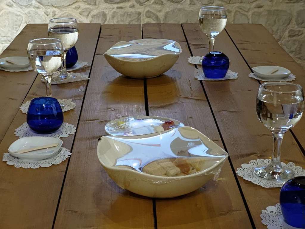 Am așteptat câteva minute pentru a pregăti sala de degustare, unde am găsit pâine, brânză și roșii (de la Papou – „Pappous” al lui, pe românește bunicul său), protejate așa cum trebuie în condițiile pandemice actuale…