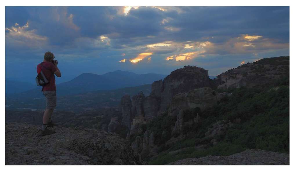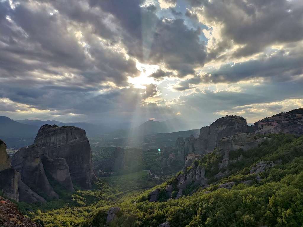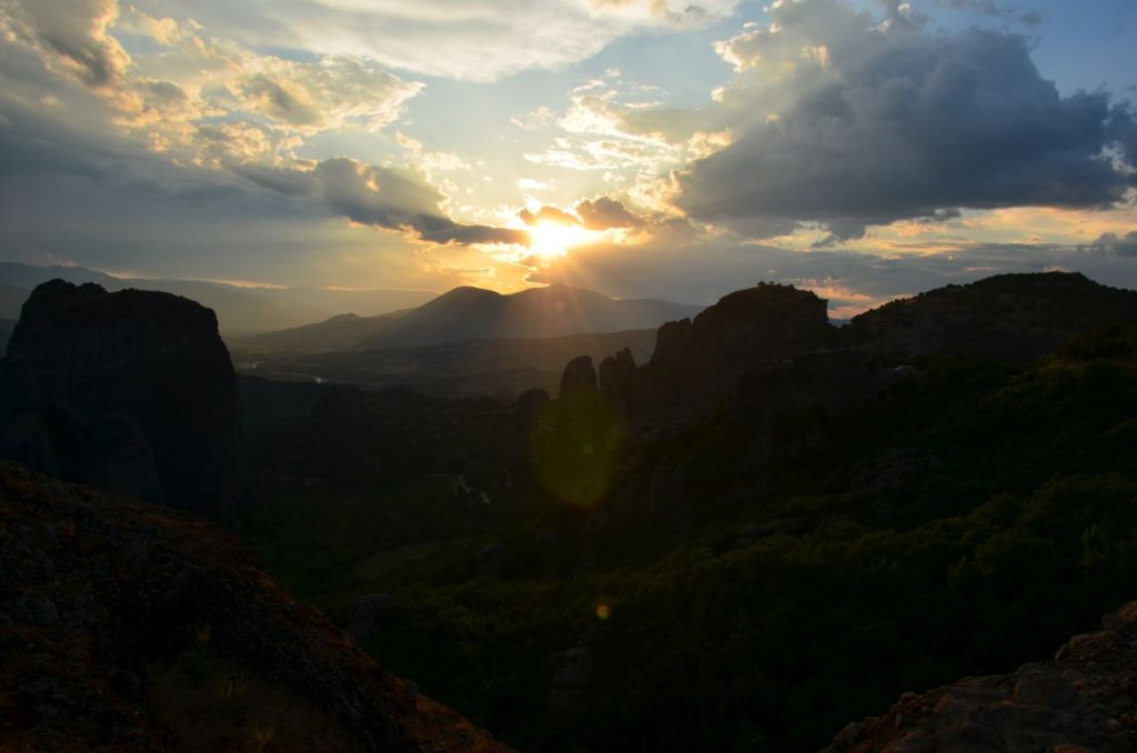 Un apus de fiecare dată altfel, deși l-am văzut mereu din același loc… ciudatele forme ale stâncilor Meteorei, mănăstirile care parcă plutesc în aer, Sf. Nicolae, Rousanou, Varlaam și Marele Meteor, dar și Sf. Ștefan în spate, cerul, norii și apusul de soare…