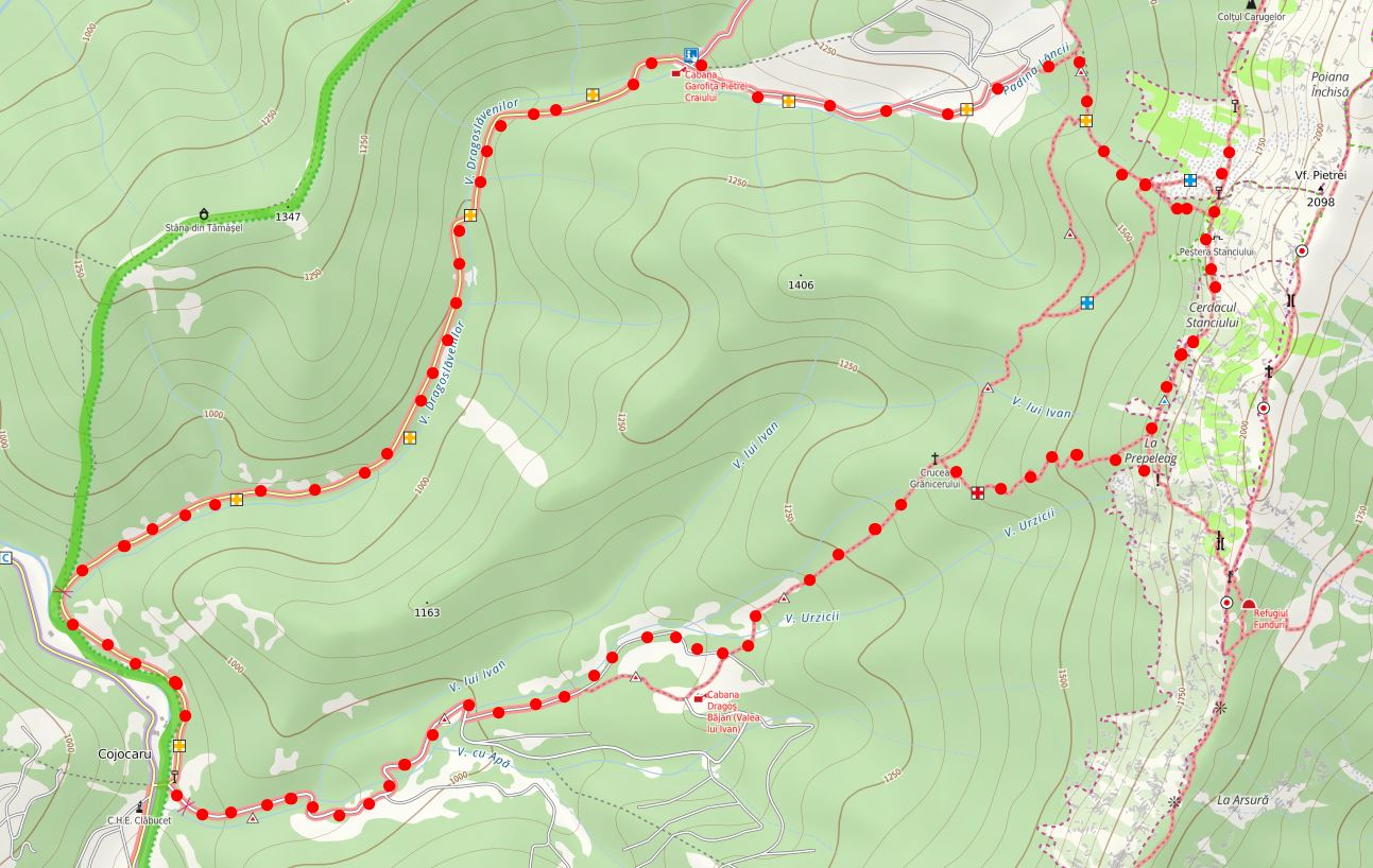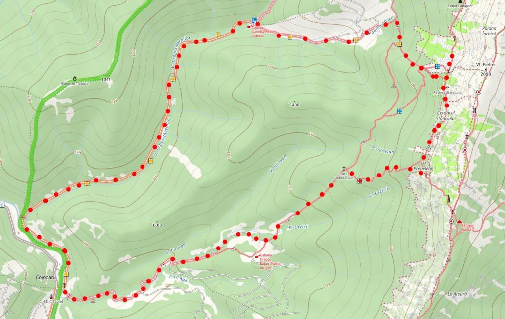 Săticul de Sus, parcare imediat după centrala electrică – Cabana Dragoș Bejan – Crucea Grănicerului (Triunghi Roșu) – La Prepeleac (Cruce Roșie) – Cerdacul Stanciului – Marele Grohotiș (Triunghi Albastru) – Cabana Garofița Pietrei Craiului (Cruce Galbenă) – Locul de parcare (Cruce Galbenă)