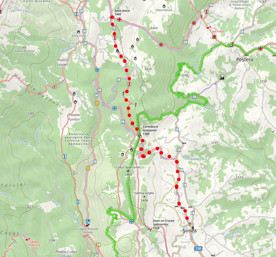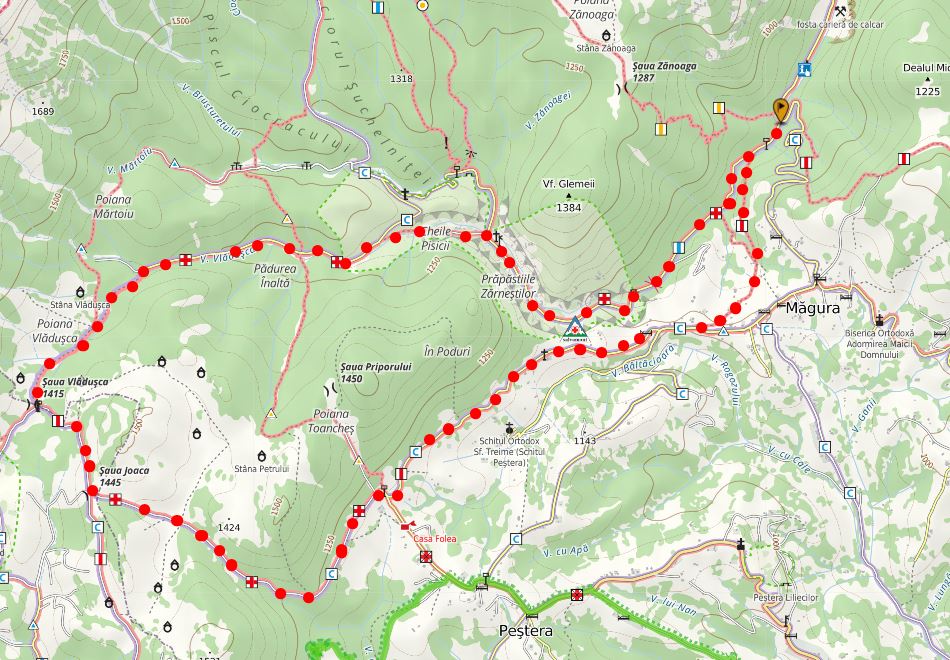 Fântâna lui Botorog (820m) – Prăpăstiile Zărneștilor – Cheia Pisicii – Șaua Vlădușca – La Table (1415m) – Șaua Joaca (1445m) – sat Peștera – Dealul Munteanului – Fântâna lui Botorog