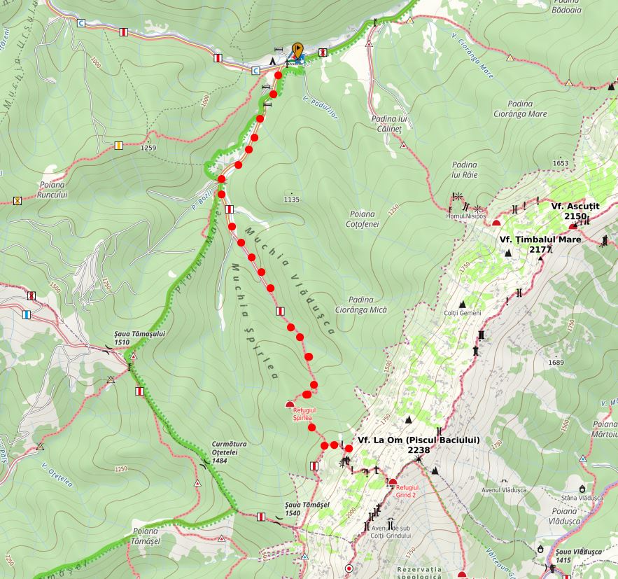 - Marcaje – Cruce Roșie până La Table, apoi Dungă Roșie pe traseul către Vf. La Om