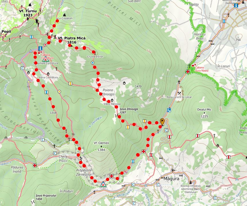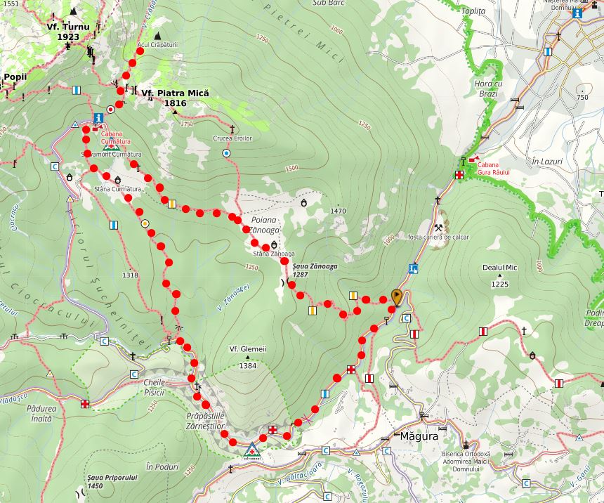 - Traseu – Fântâna lui Botorog (830m) – Prăpăstiile Zărneștilor – Valea Curmăturii – Cabana Curmătura (1470m) – Punctul de belvedere din Șaua Crăpăturii (1660m) – Cabana Curmătura – Poiana Zănoaga – Fântâna lui Botorog