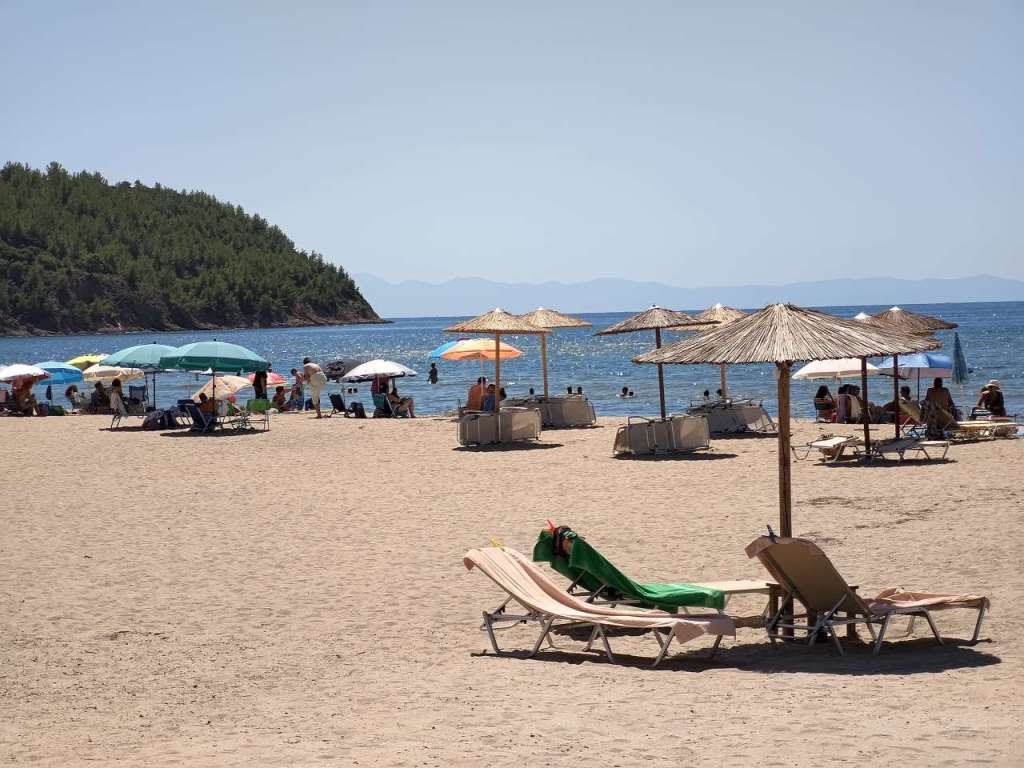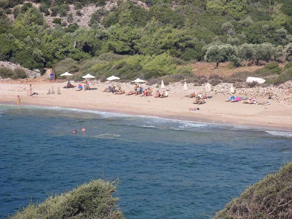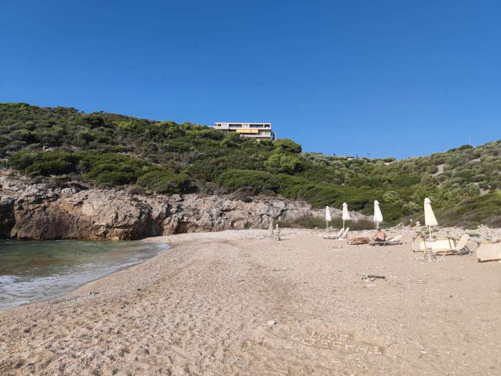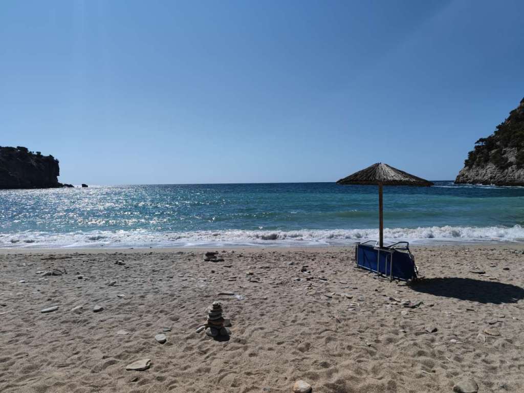 Dar plaja, plaja minunată. Un golfuleț cu ape azurii, plajă amenajată cu baldachine, chiar și o mică tavernă…