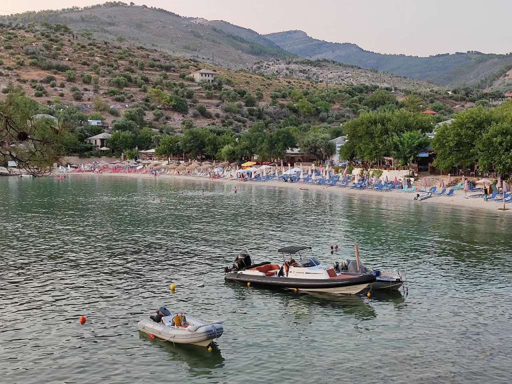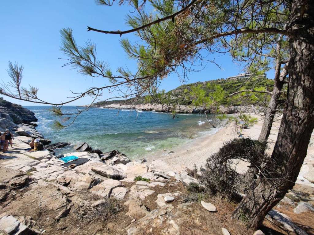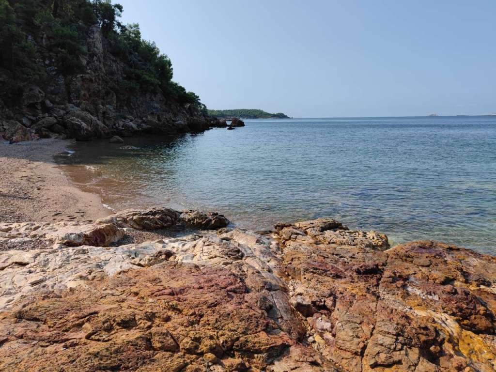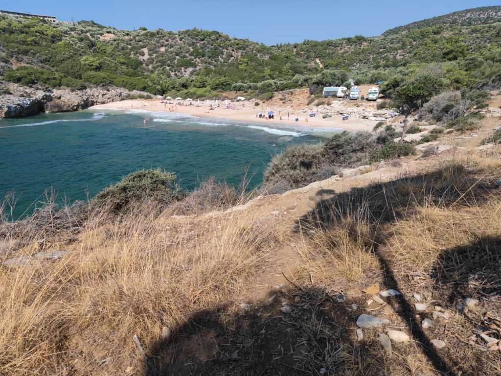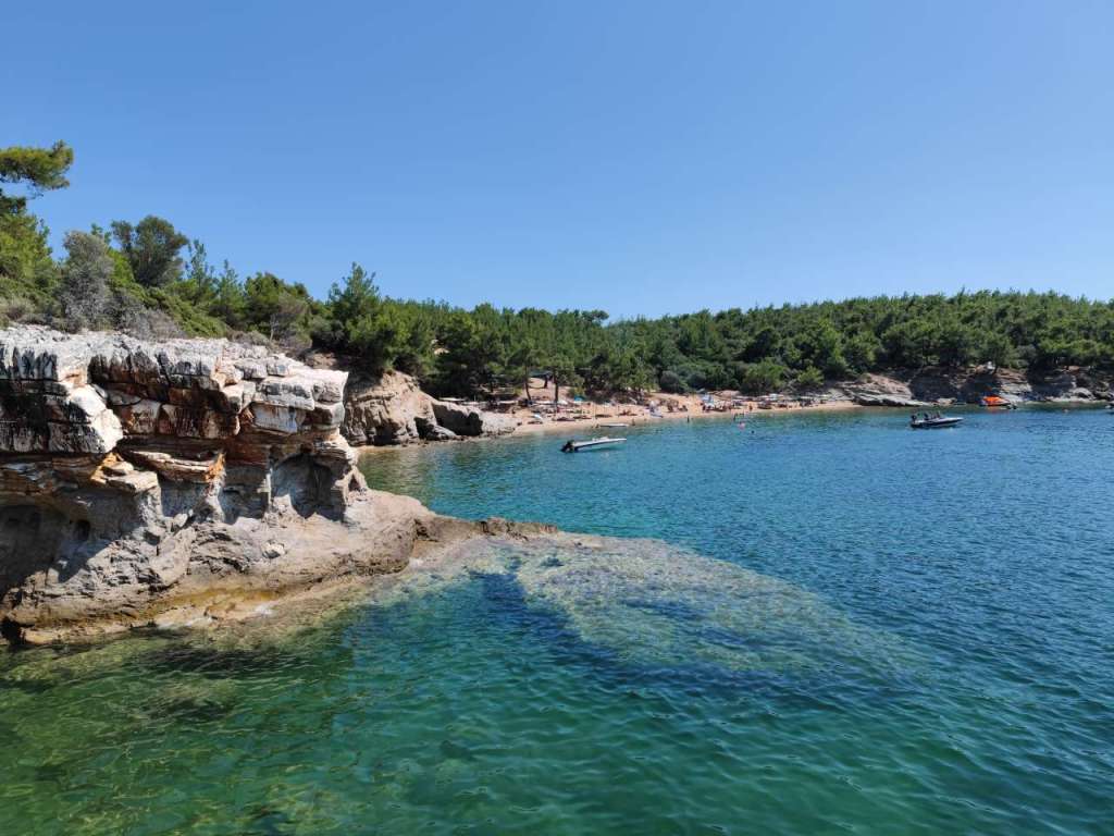 Dar plaja, plaja minunată. Un golfuleț cu ape azurii, plajă amenajată cu baldachine, chiar și o mică tavernă…
