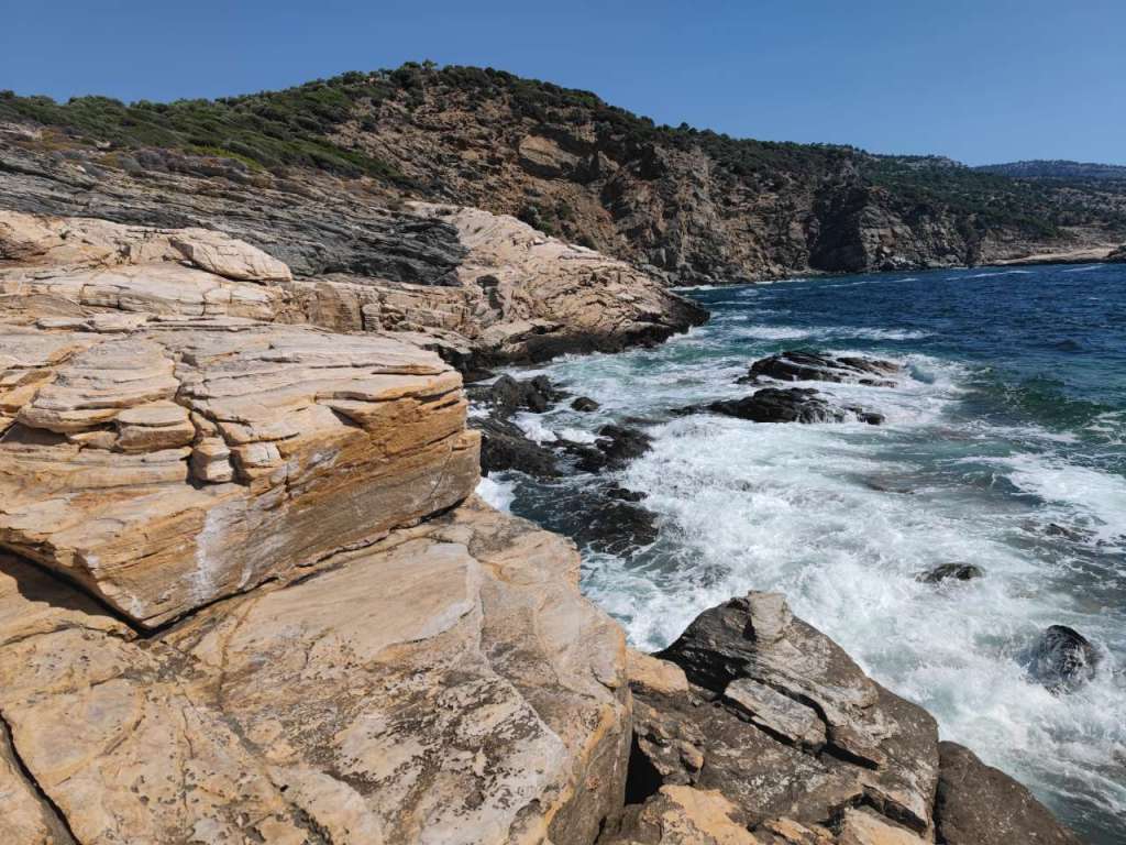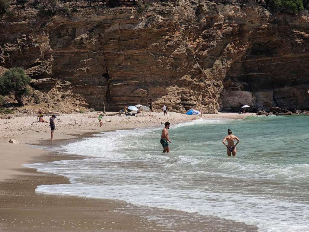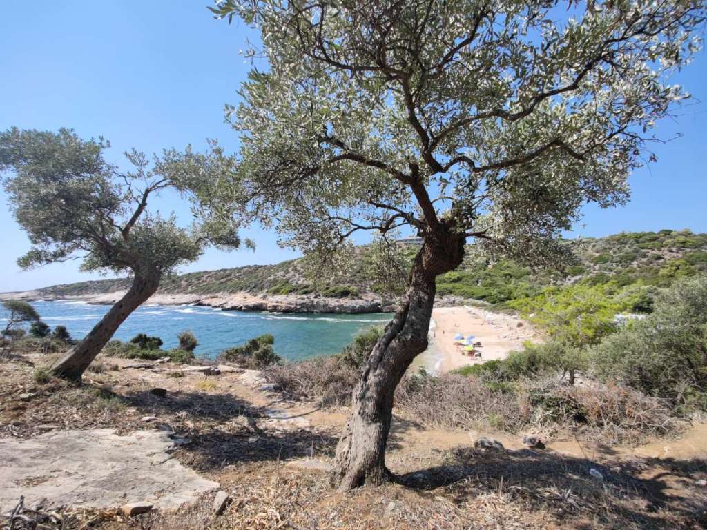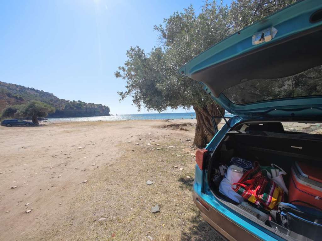 Am parcat mașina la umbră printre măslini și ne-am bucurat pentru câteva ore de liniște, soare, Mareea Egee cu ale sale valuri… Fără prea mulți turiști în jurul nostru, încă un plus din punctul nostru de vedere.