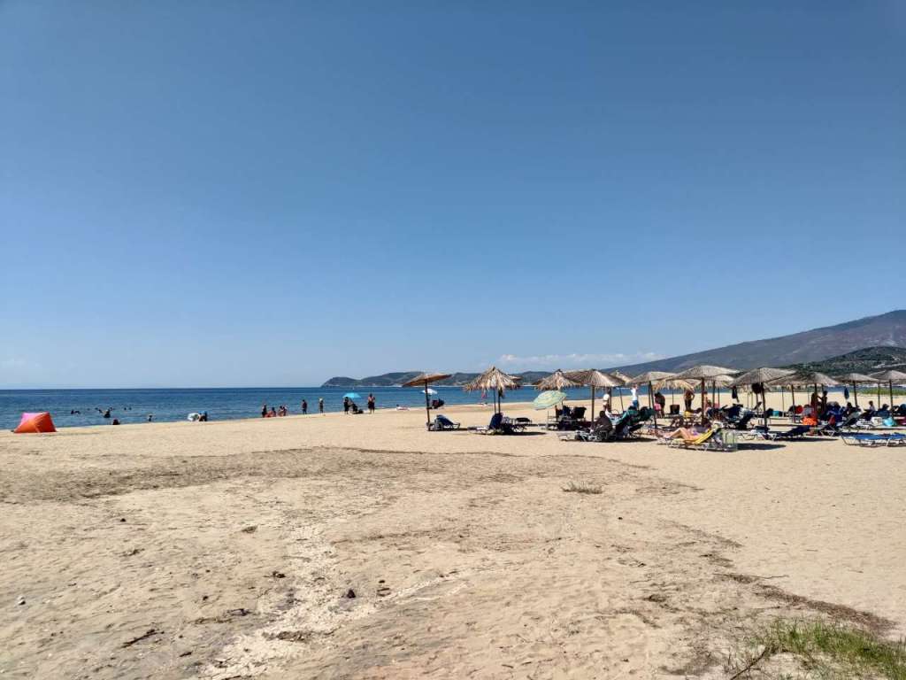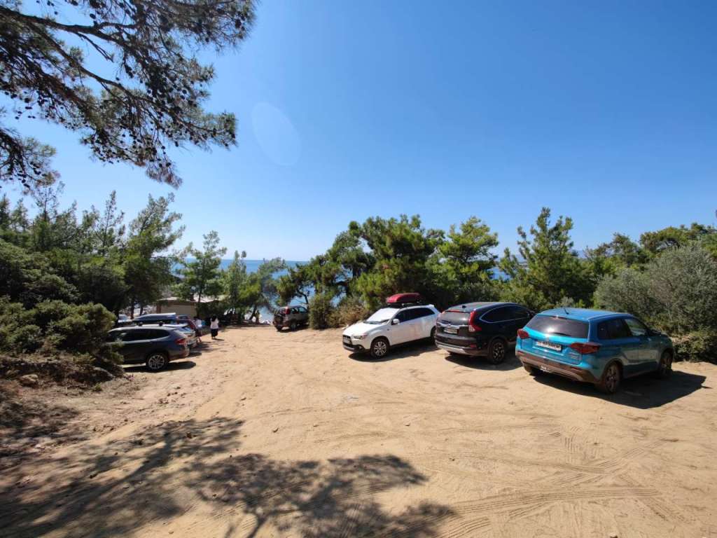 Plajă mare, largă, cu nisip, cu zone de șezlonguri, taverne dar și o parcare generoasă pentru mașini. Chiar acolo, lângă ea.