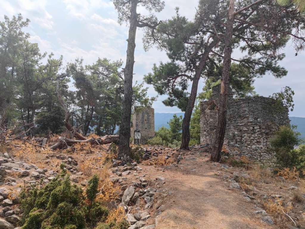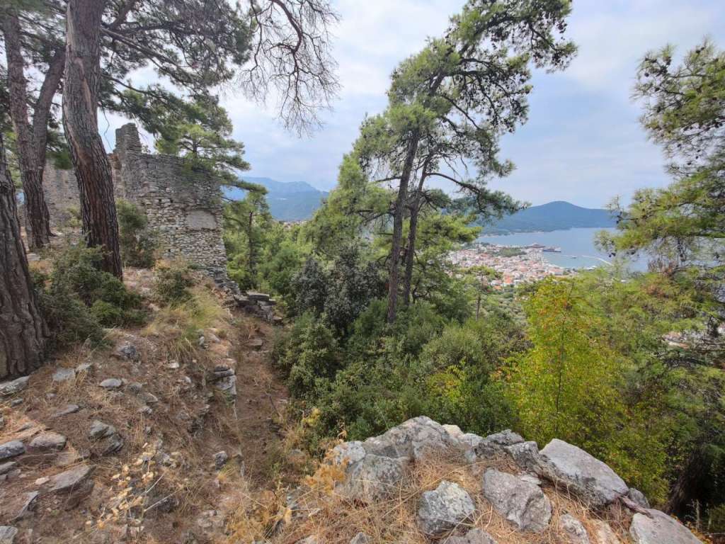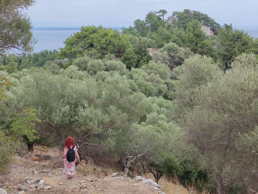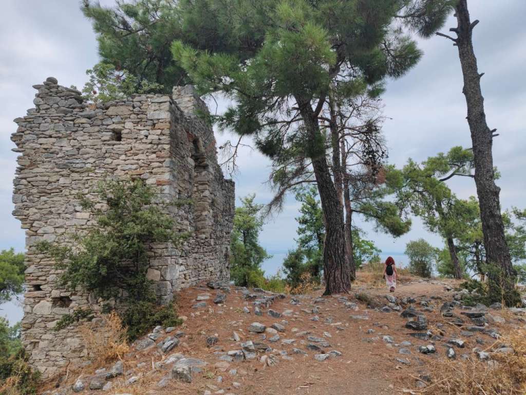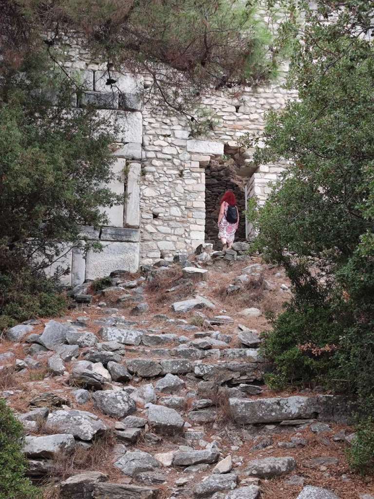 Și, din nou, cu forțe proaspete, tot în sus. După aproape jumătate de oră suntem la primele ruine de sus. După hartă, aici ar fi fost Acropolele din Thasos. Un pic mai departe, pe o stâncă aflată la vreo 200 de metri, alte ziduri și alte ruine, mai semețe, mai îndrăznețe, ne încântă privirile și ne stimulează să le vedem de aproape.