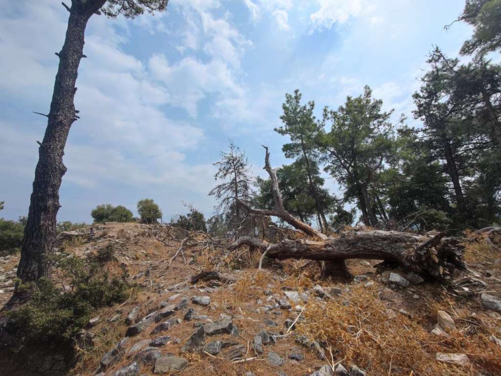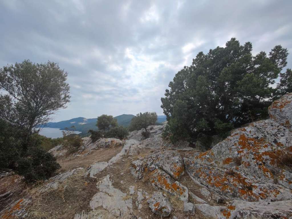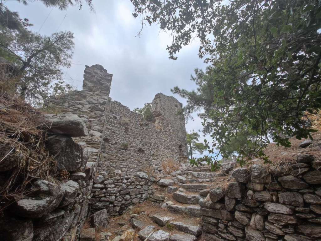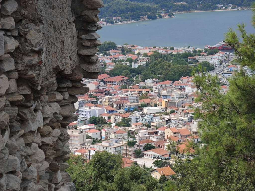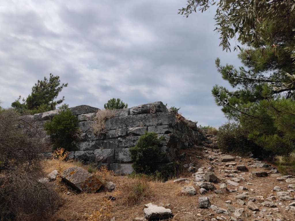 Și, din nou, cu forțe proaspete, tot în sus. După aproape jumătate de oră suntem la primele ruine de sus. După hartă, aici ar fi fost Acropolele din Thasos. Un pic mai departe, pe o stâncă aflată la vreo 200 de metri, alte ziduri și alte ruine, mai semețe, mai îndrăznețe, ne încântă privirile și ne stimulează să le vedem de aproape.