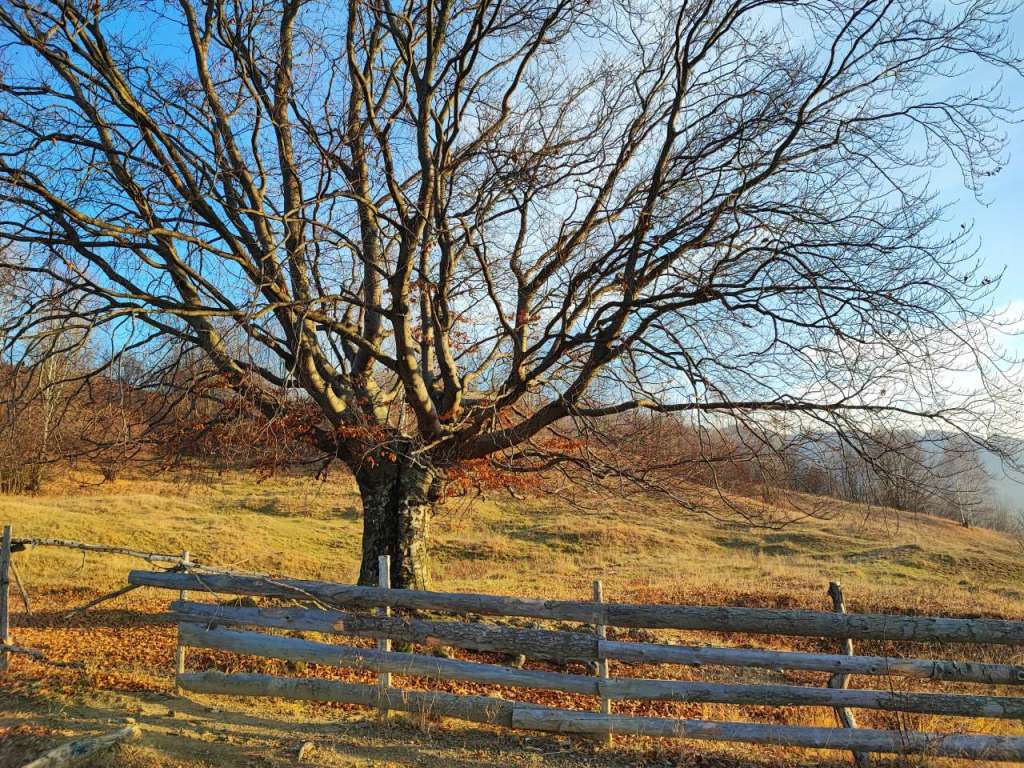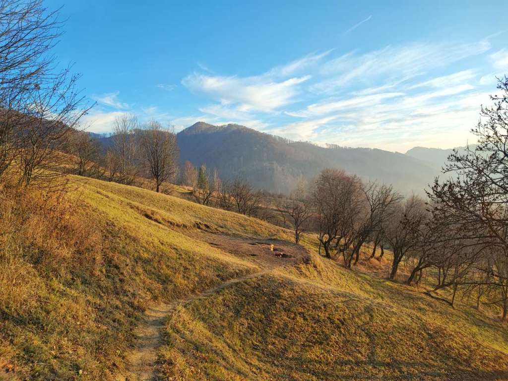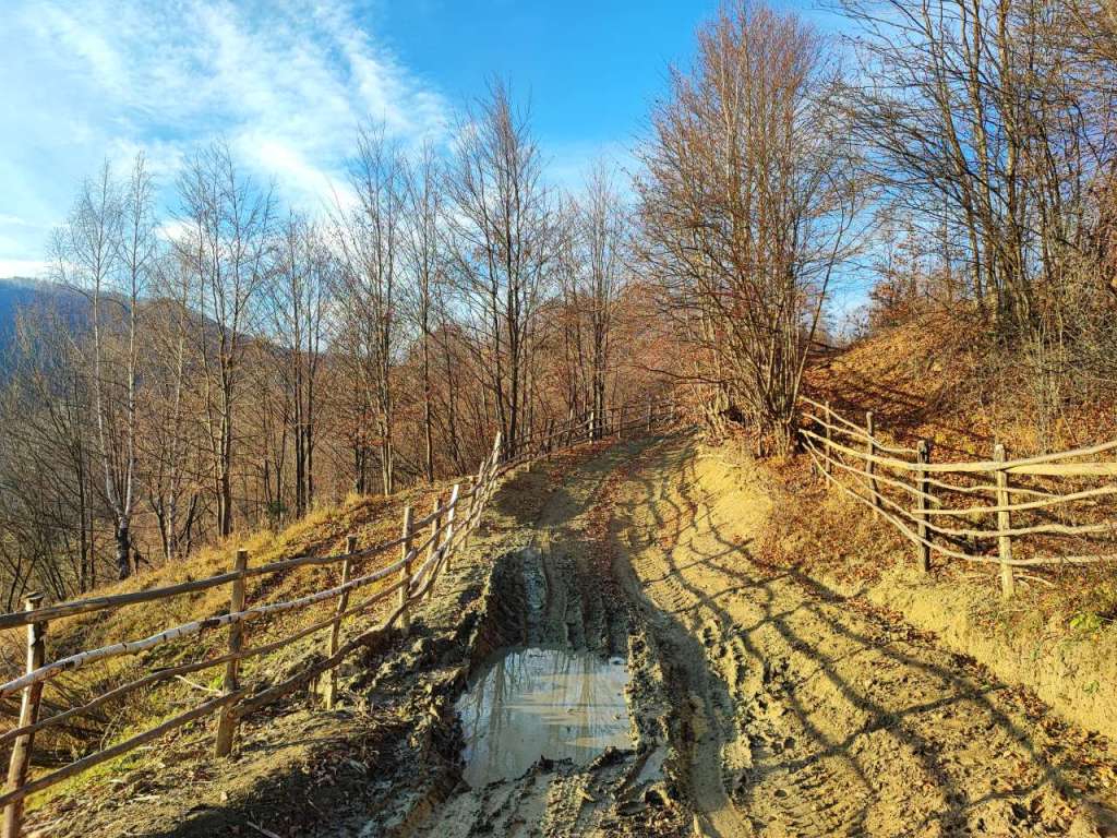 Am trecut râul pe podețul mișcător și am urcat destul de susținut pentru vreo 30-40 de minute, până la altitudinea de 1400m. Cam alunecos drumul, cu nămol și ceva șleauri pe care le-am ocolit cu grijă. Un drum adevărat de zonă muntoasă, un drum de acces pentru căruțele și utilajele localnicilor mărginit de garduri din lemn și de bătrâni fagi, cu crengi noduroase, acum dezgolite și aproape fără urmă de frunze.