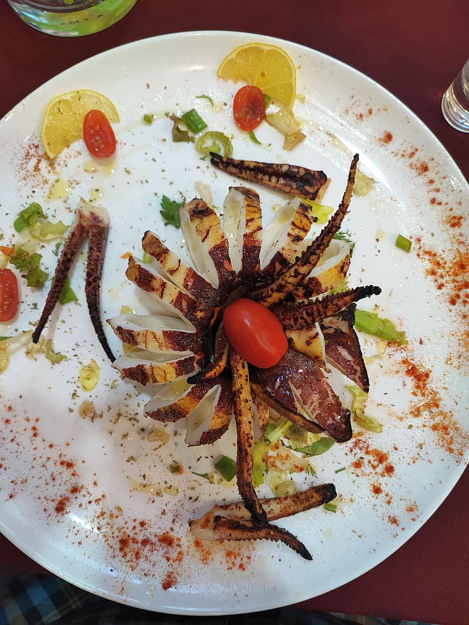 … calamar pe grătar ca la mama lui în Thasos, sau în Corfu, sau oriunde vreți voi în Grecia, pe care eu personal l-am stropit cu un pic de sos de usturoi… Proaspăt, fraged, pus pe grătar nici prea mult, nici prea puțin, îndeajuns cât să declar că am mâncat ceva excelent!