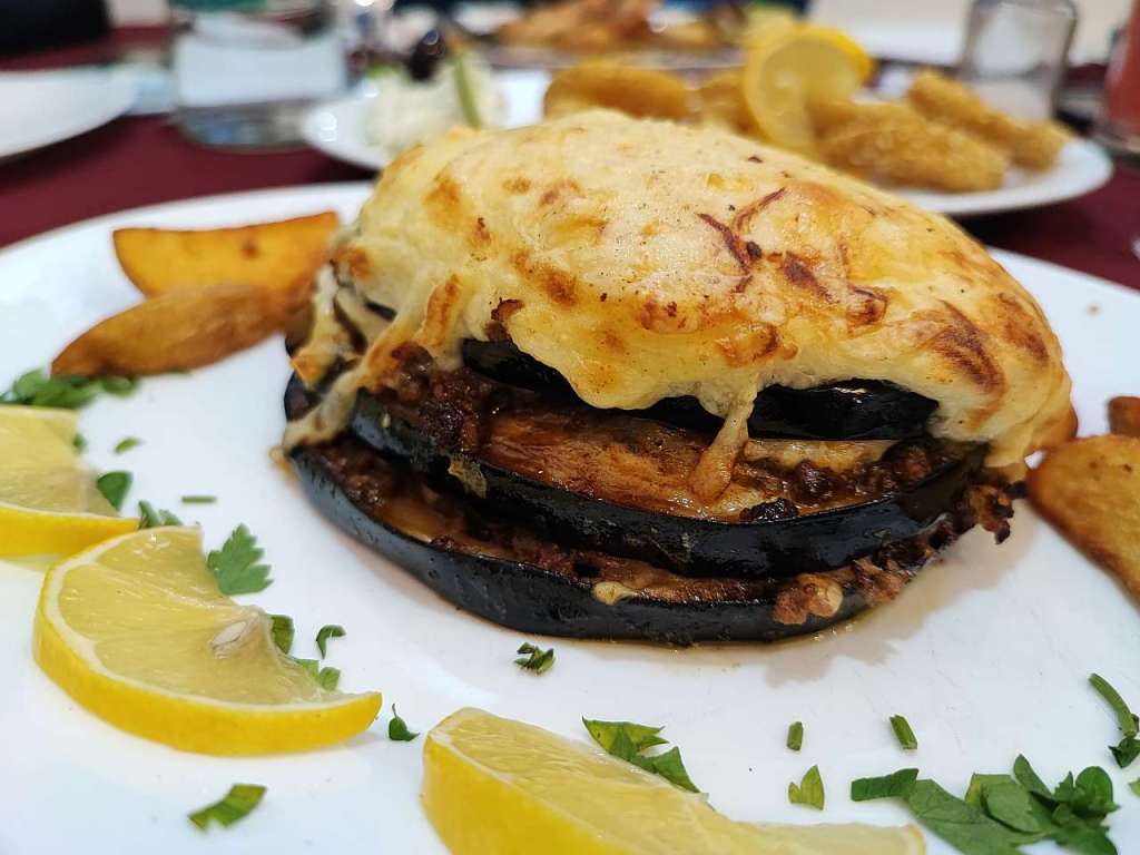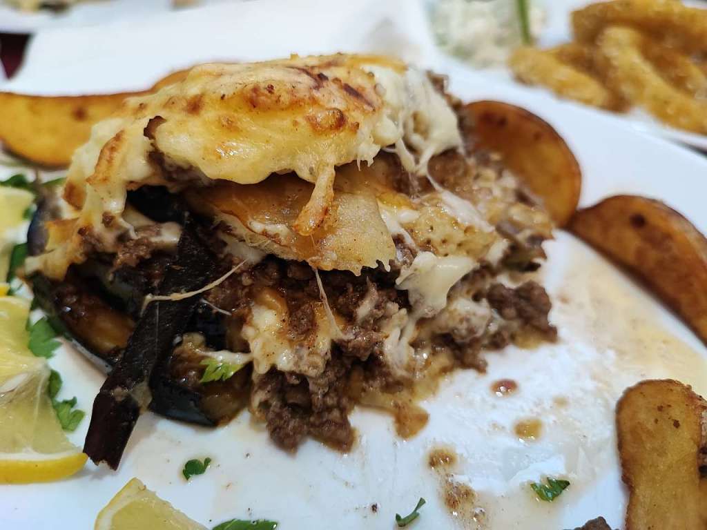 … dar și o bunătate de paputsakia, vinete cu carne tocată și brânză, puse una peste alta în straturi la cuptor, delicioasă!