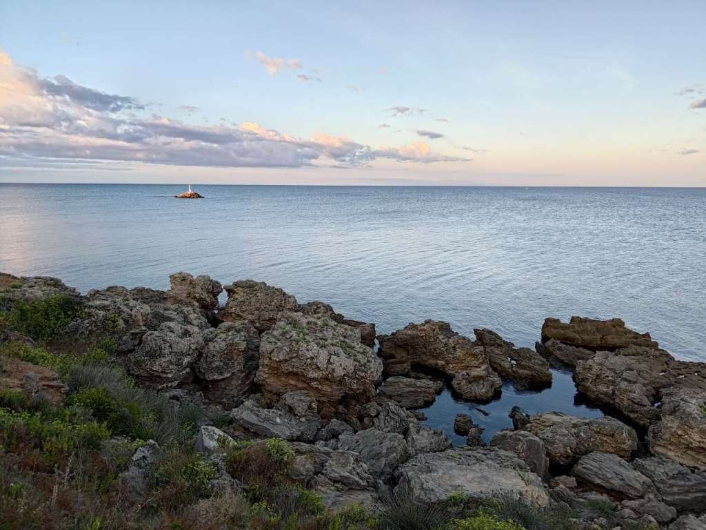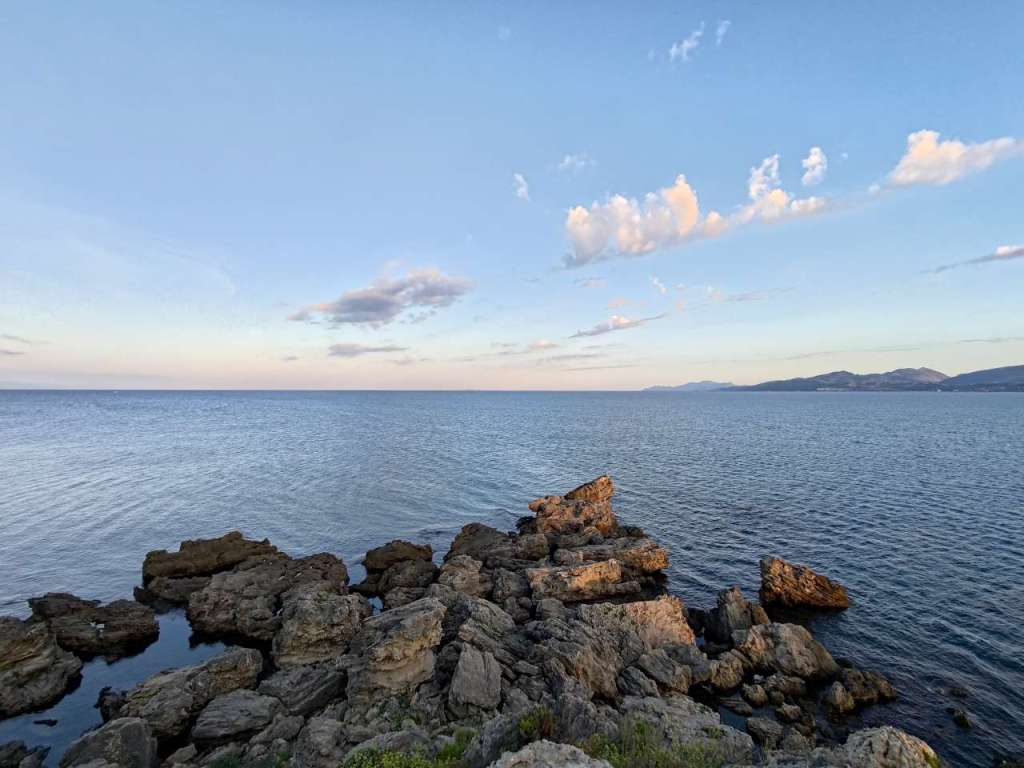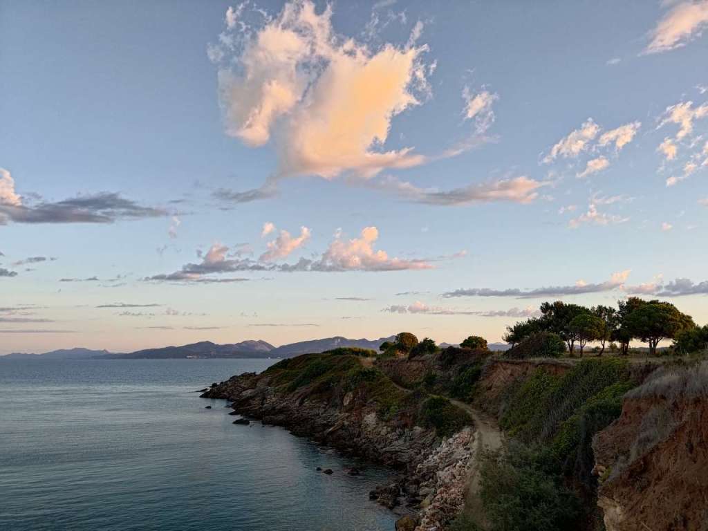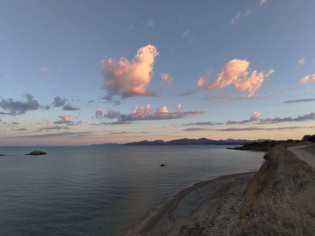 Ne plimbăm seară de seară, ba acum, în septembrie, când temperaturile sunt mai rezonabile, chiar și pe timpul zilei. Pe străduțele sătucului, cu ochii după fructele exotice pentru noi, rodii, banane, lyme, lămâi, portocale, pe faleza care urmărește conturul mării, către micuțul port, aflat în renovare acum, pe lângă pinii cu coama rotundă…