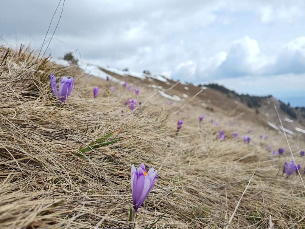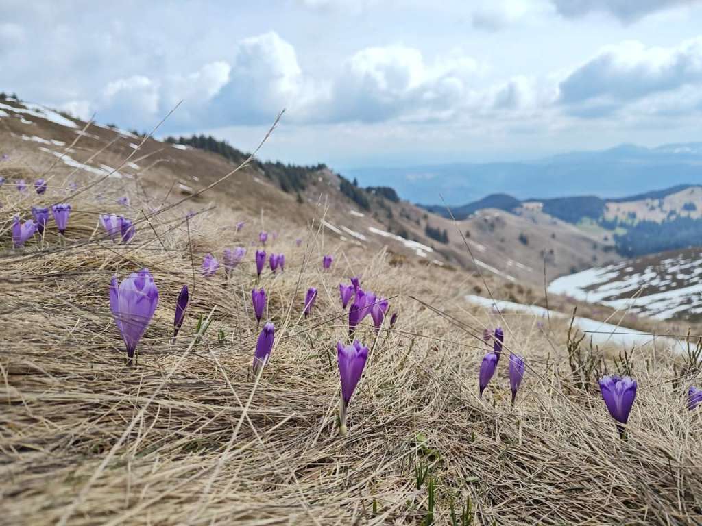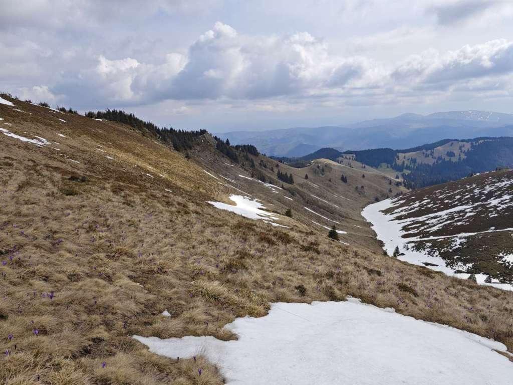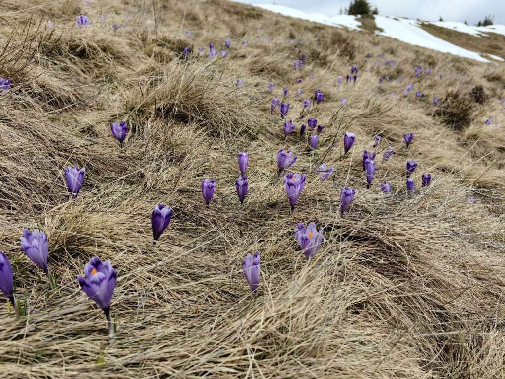 Zăpada nu foarte mare dar nici deloc, urcarea nu prea grea dar nici ușoară, am călcat pe urmele lăsate de alți turiști sau pe cele ale blănosului cu labe mari și gheare lungi, iar după aproape o oră ne bucuram de o poieniță plină ochi de brândușe cu petalele deschise pe șaua Gropșoarele.