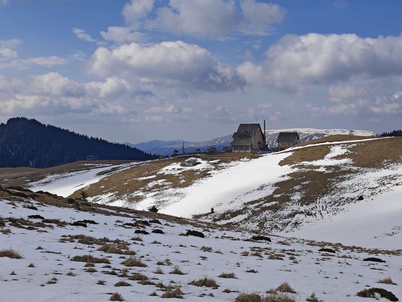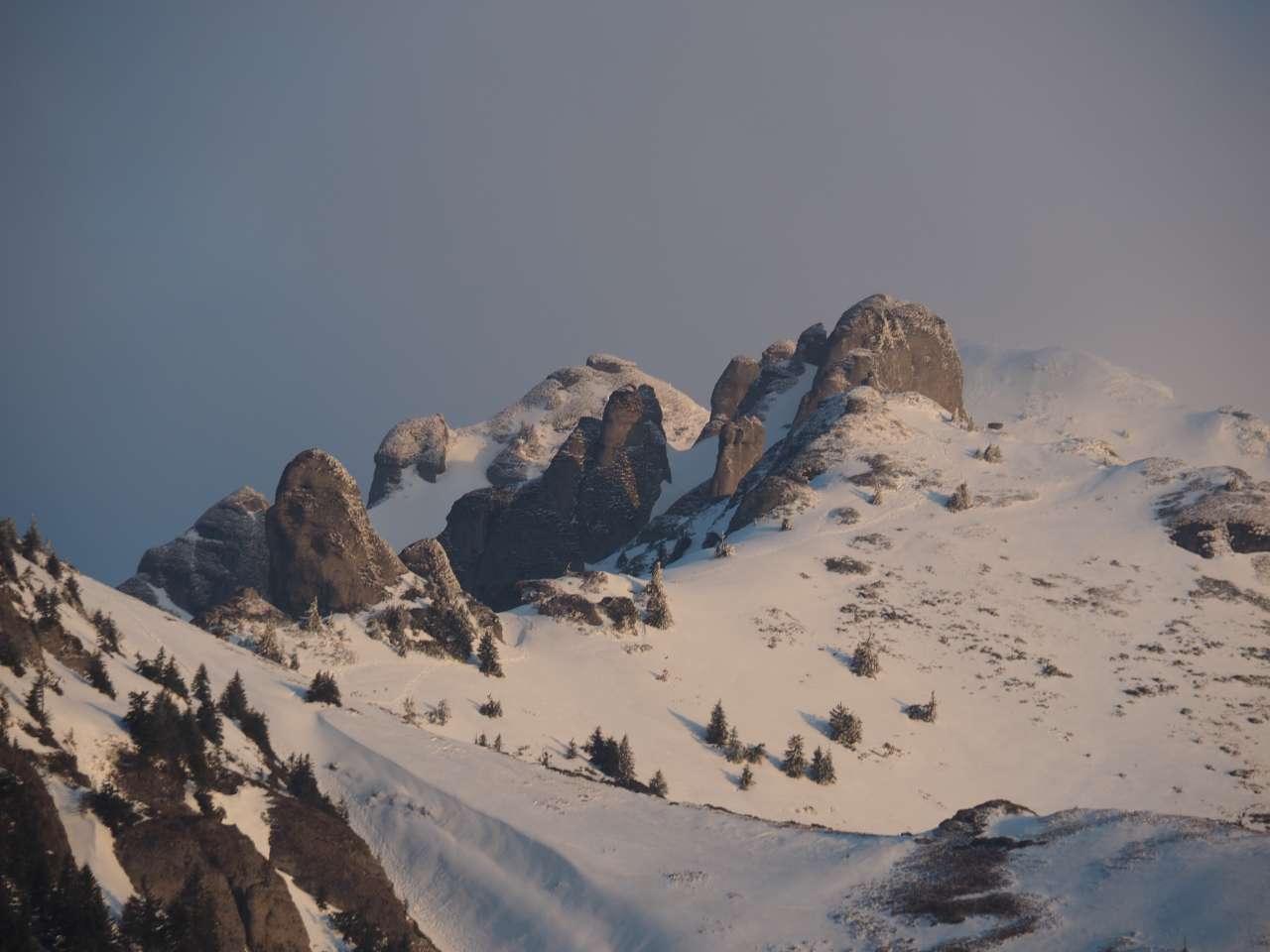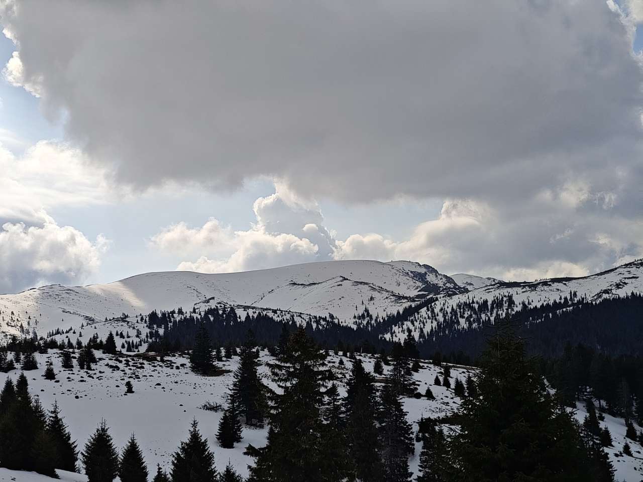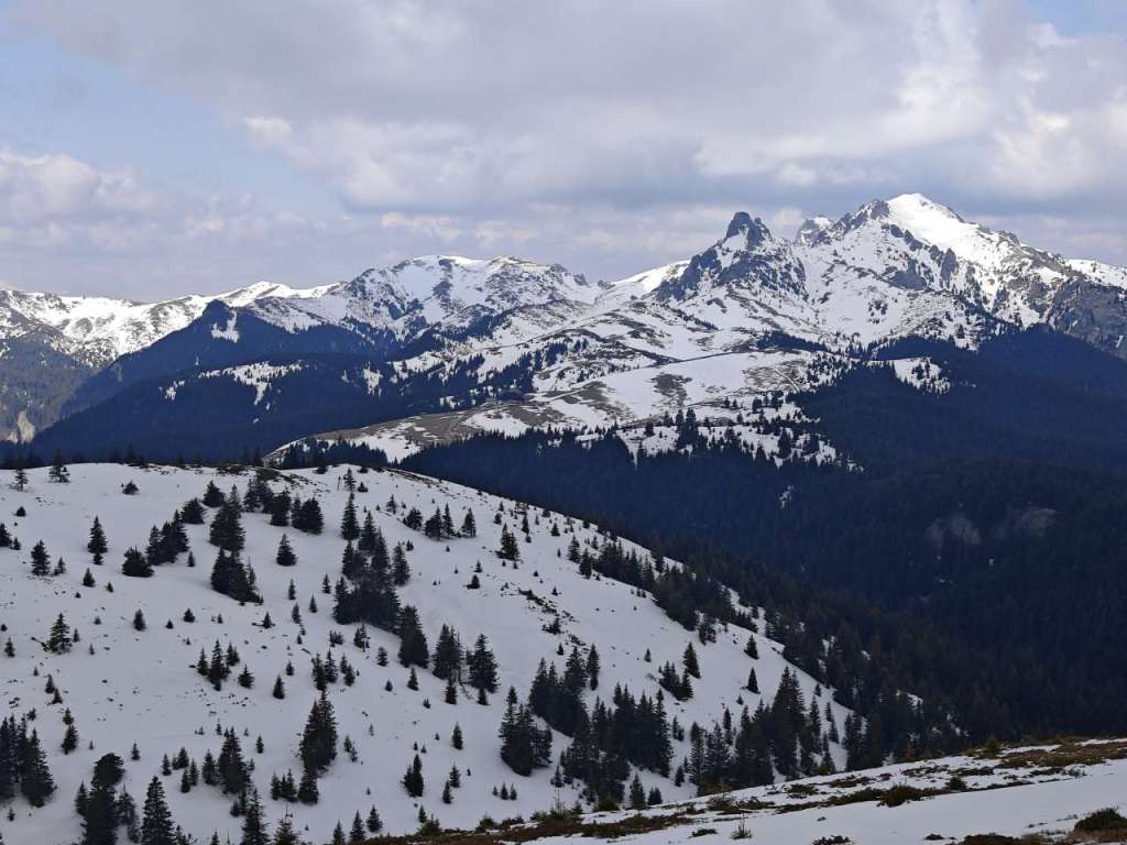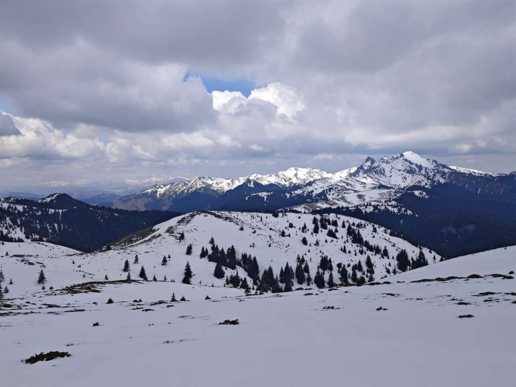 Zăpada destul de tare, încă înghețată după noapte, așa că nu m-am afundat prea tare și efortul nu a fost unul foarte mare, dar nici ca atunci când te plimbi prin oraș nu a fost. Clar că deja transpirasem când am urcat pe șaua Gropșoarele. De unde vântul începea să-și facă de cap.