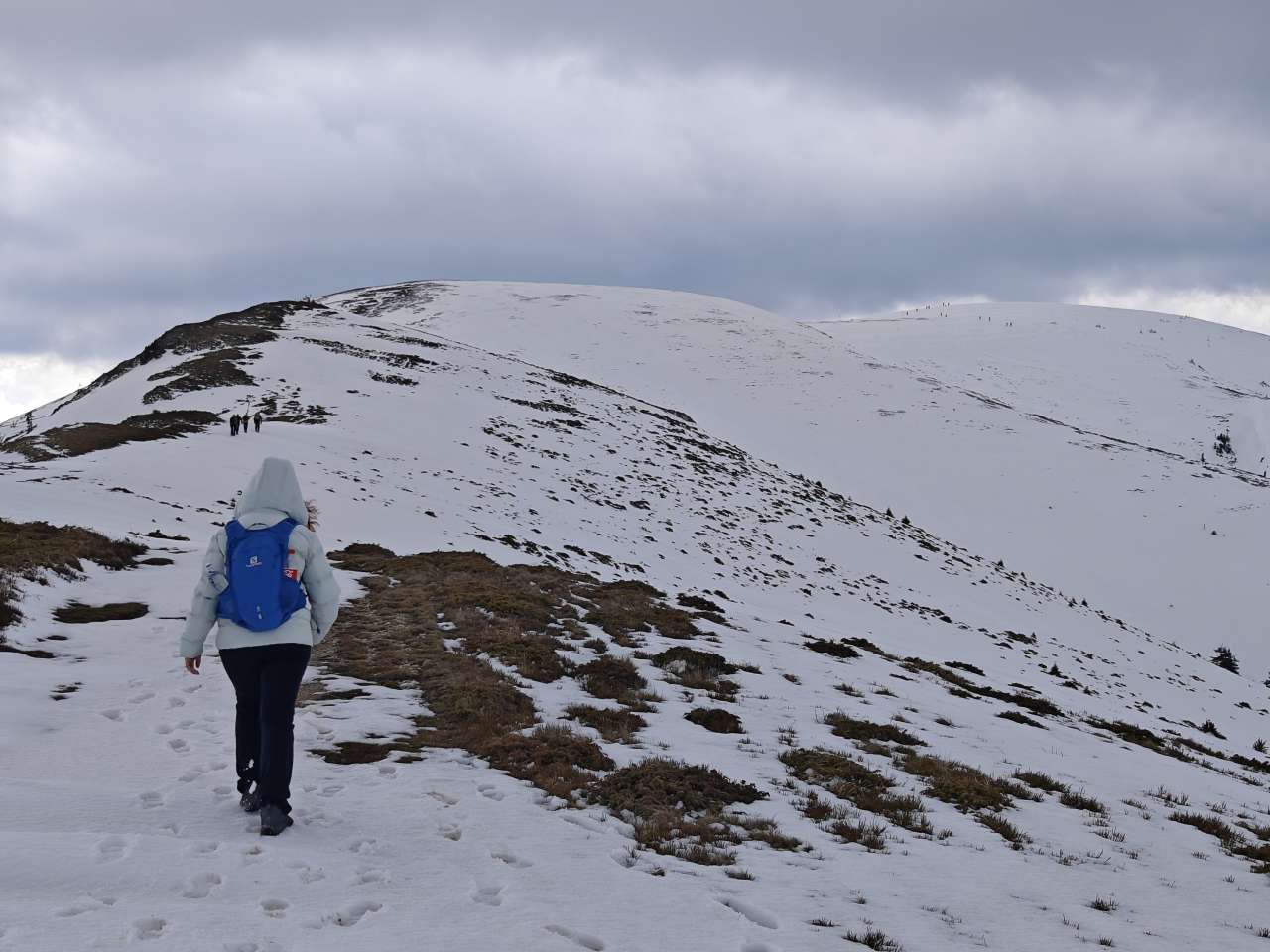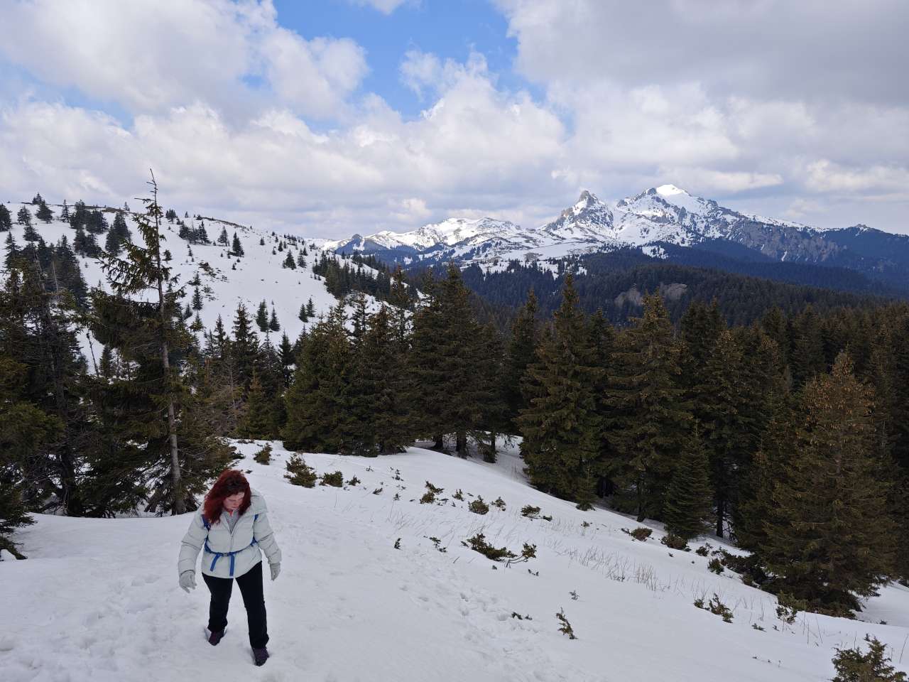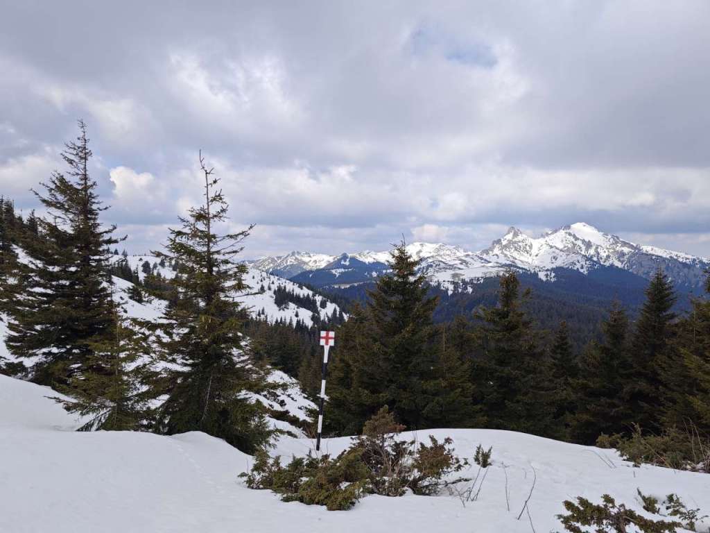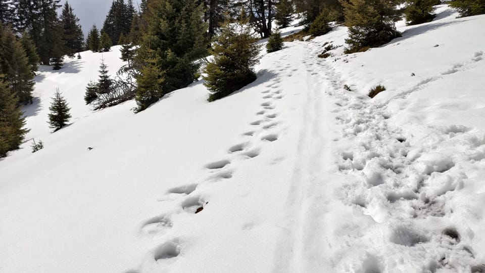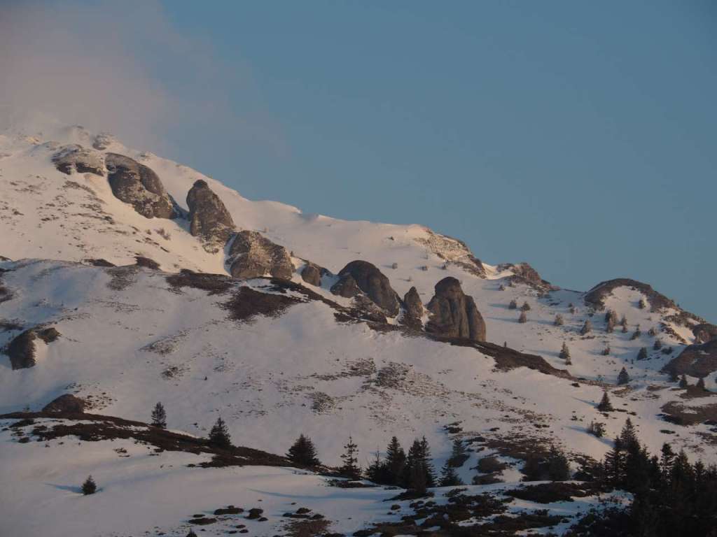 Noi doi am mers mai greu, așa că ieșiți din pădure, prietenii noștrii au luat-o la pas întins, noi ținându-le urma din ce în ce mai greu, pentru că sus pe culme zăpada a fost un pic mai adâncă, începuse să se înmoaie și pe multe porțiuni mă afundam din ce în ce mai mult iar efortul devenea tot mai asiduu.