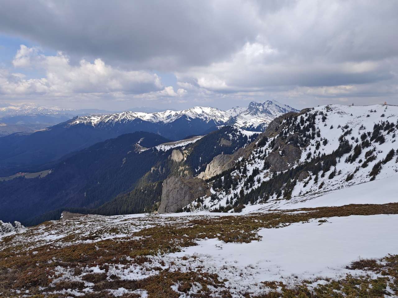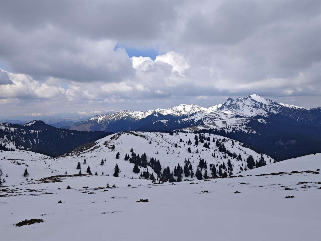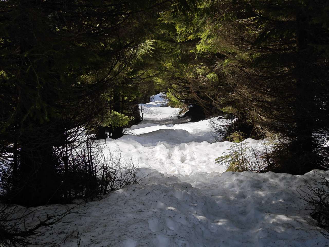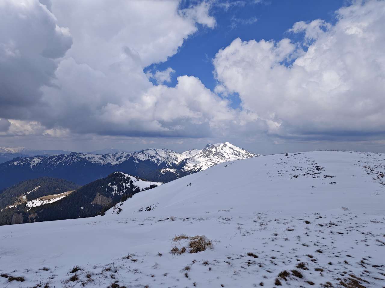 Noi doi am mers mai greu, așa că ieșiți din pădure, prietenii noștrii au luat-o la pas întins, noi ținându-le urma din ce în ce mai greu, pentru că sus pe culme zăpada a fost un pic mai adâncă, începuse să se înmoaie și pe multe porțiuni mă afundam din ce în ce mai mult iar efortul devenea tot mai asiduu.