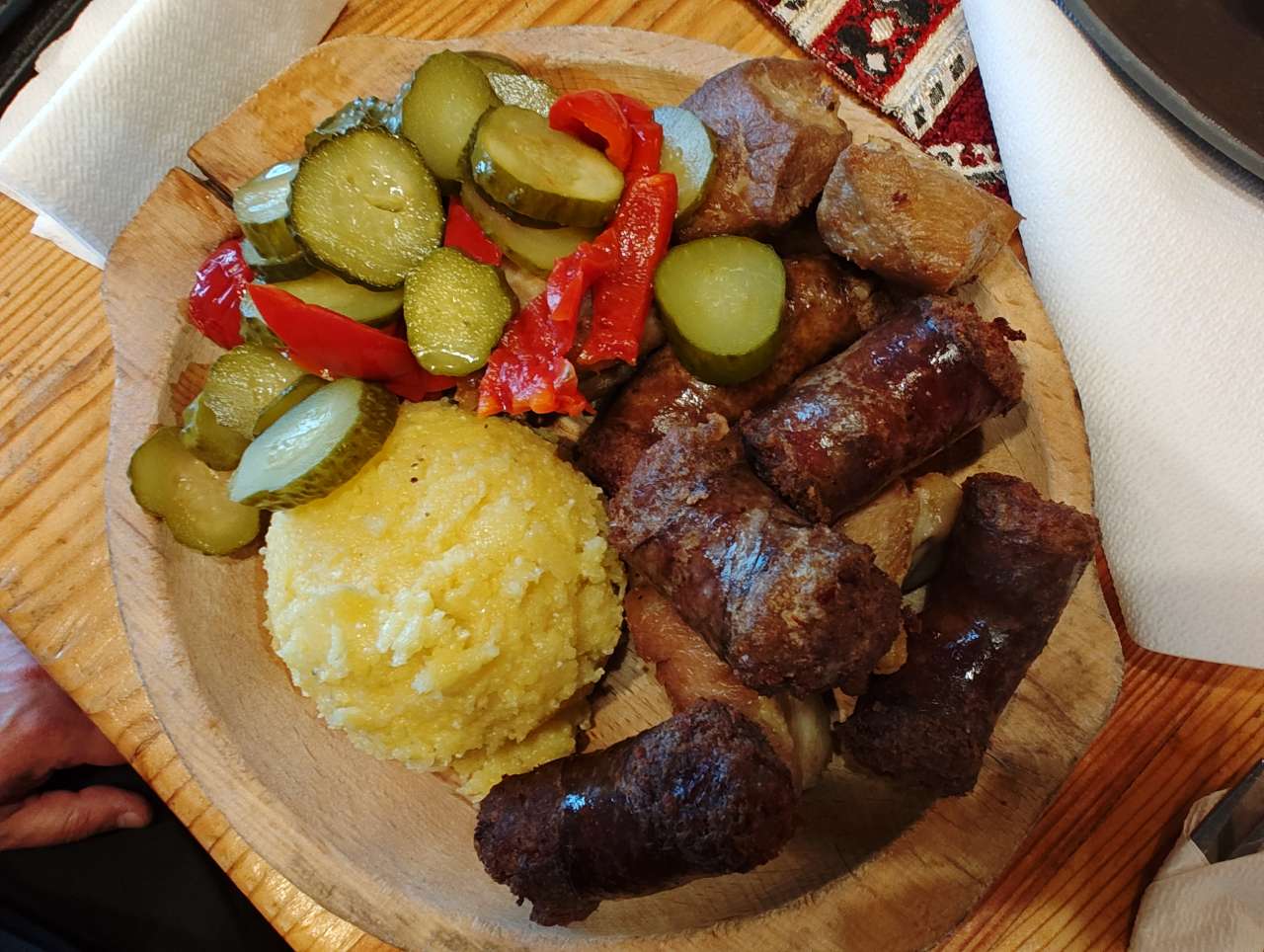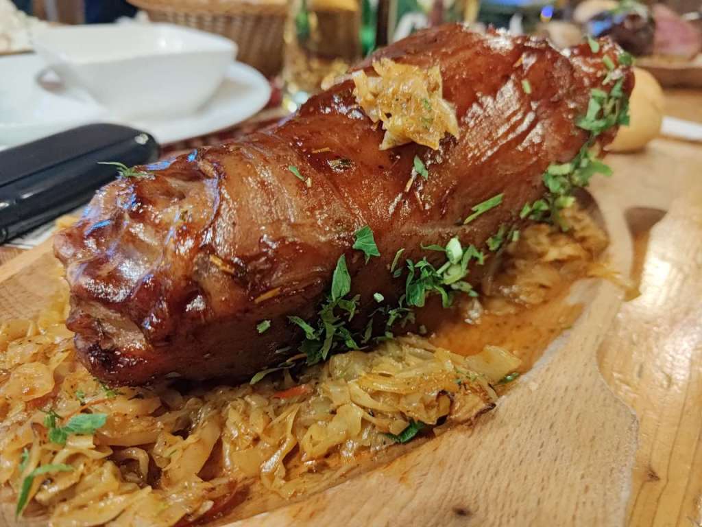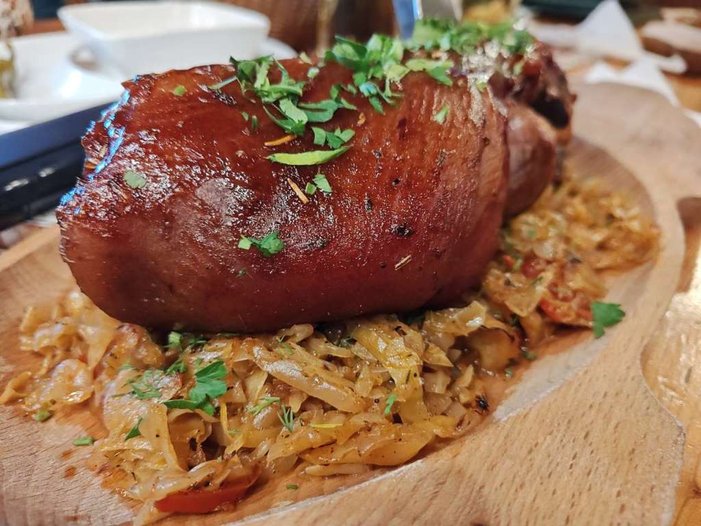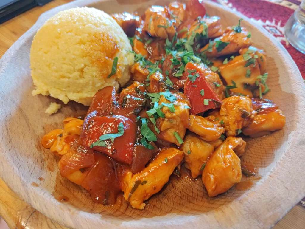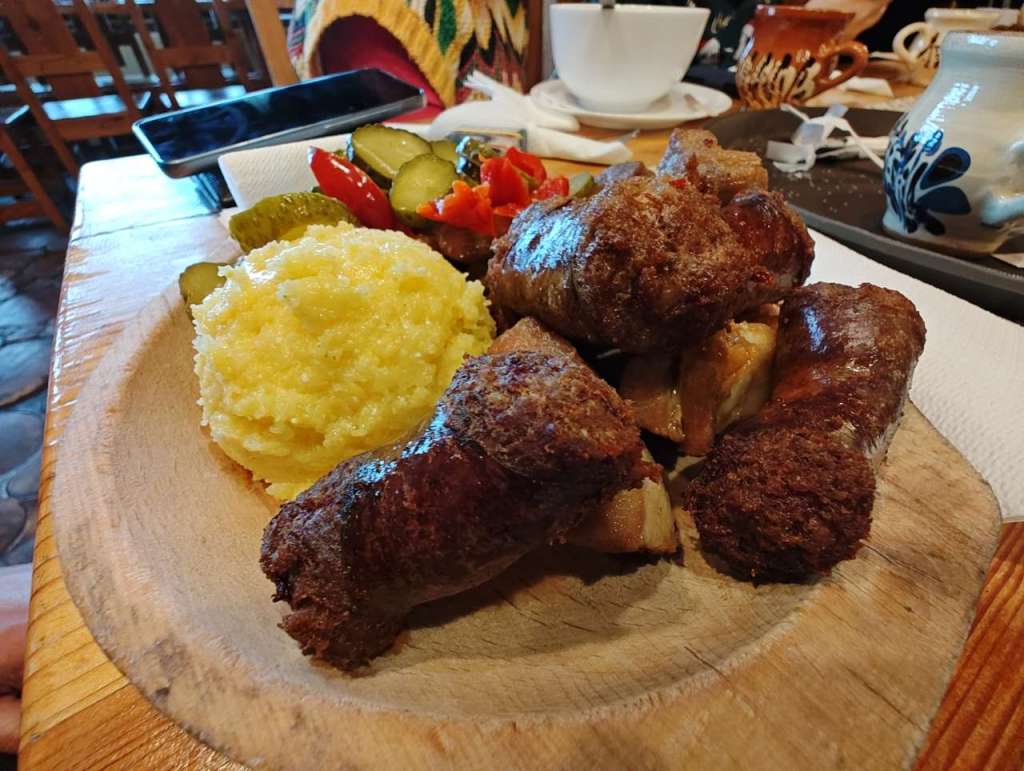 Apoi, pe la orele 17.00 ne-am strâns în restaurant pentru a mânca câte ceva. Mai o ciorbiță, de burtă, de fasole sau de legume, după preferințele fiecăruia, mai un ciolan afumat cu vărzică, mai niște saramură de pui cu mămăliguță, mai un bulz sau o mămăliguță cu brânză și smântână, să nu uit de renumiții cârnați și carne la garniță, asezonați cu murături, fiecare după ce i-a poftit inima. Mâncarea foarte bună, meniu tradițional în general, toată lumea mulțumită.