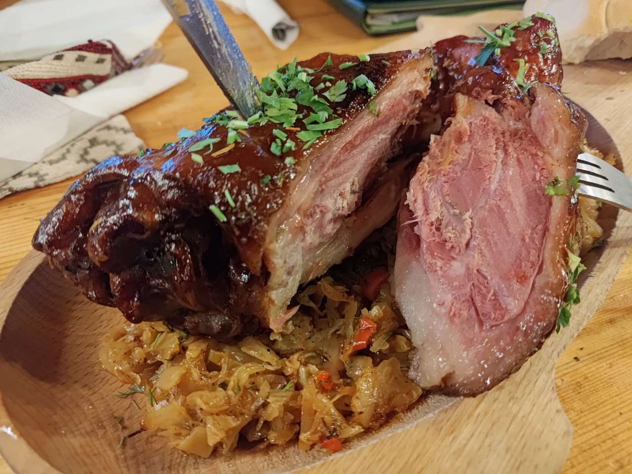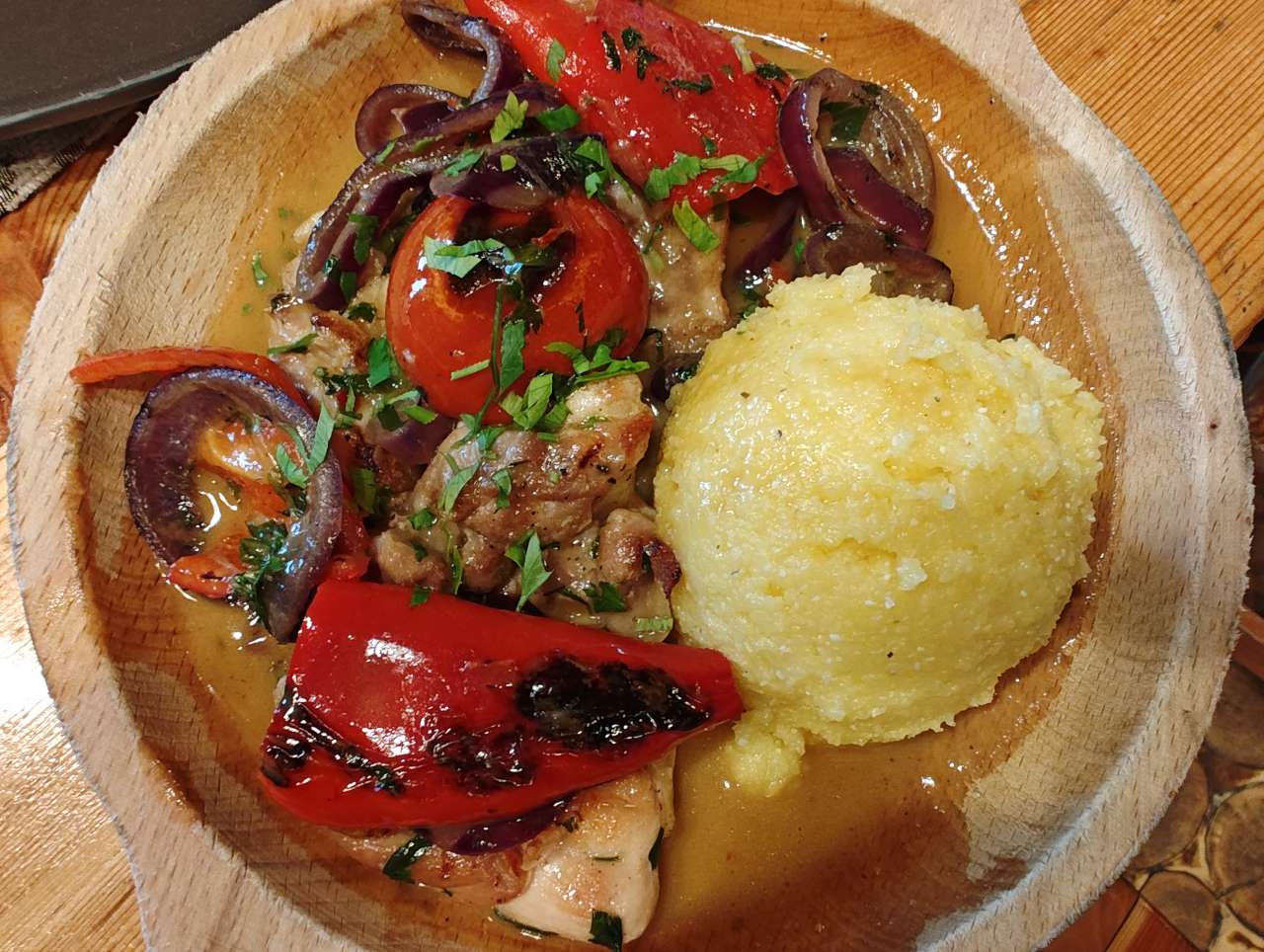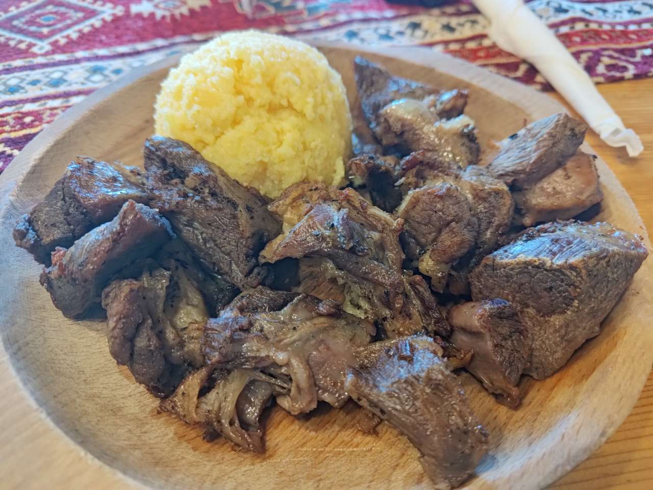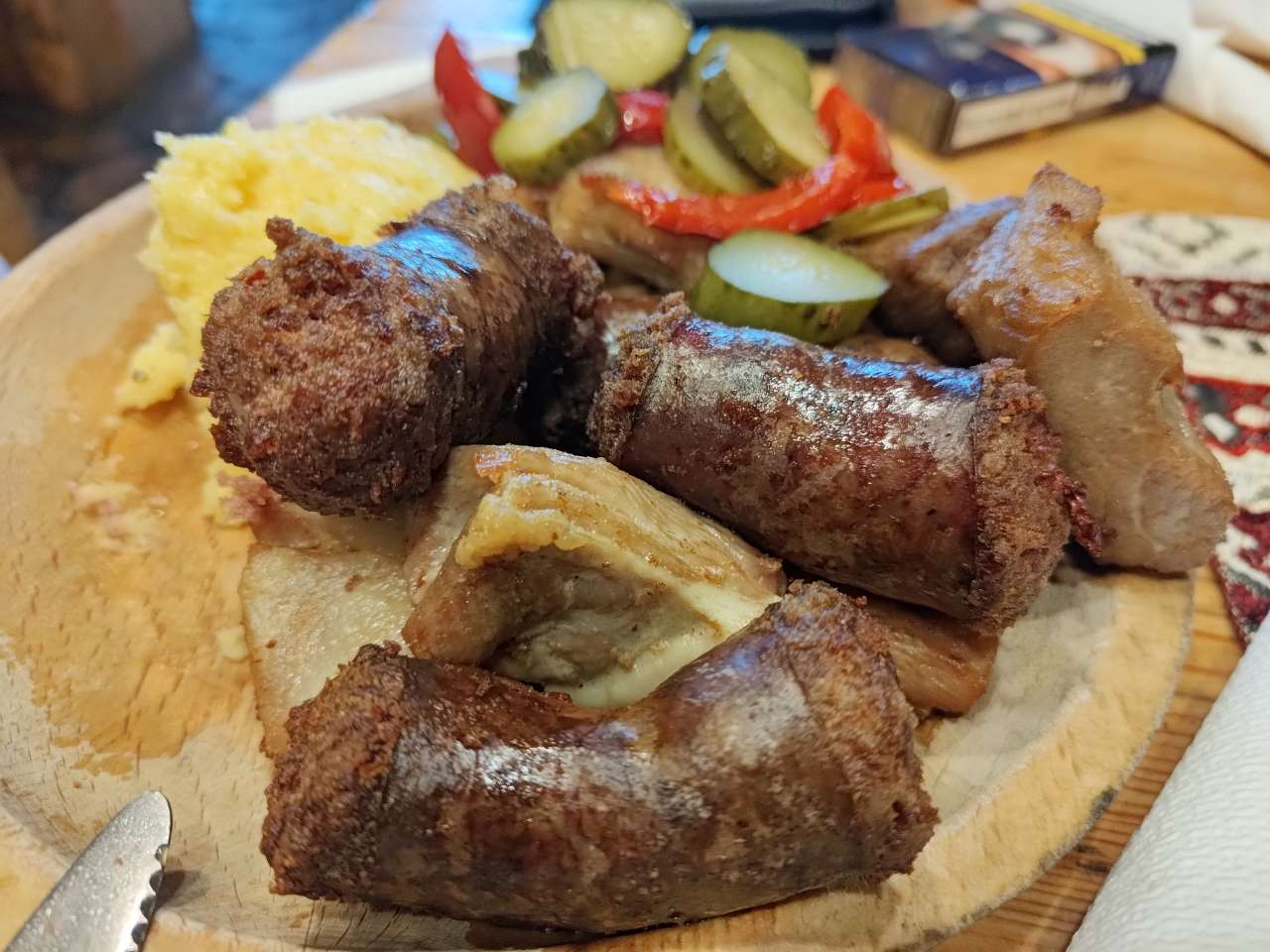 Apoi, pe la orele 17.00 ne-am strâns în restaurant pentru a mânca câte ceva. Mai o ciorbiță, de burtă, de fasole sau de legume, după preferințele fiecăruia, mai un ciolan afumat cu vărzică, mai niște saramură de pui cu mămăliguță, mai un bulz sau o mămăliguță cu brânză și smântână, să nu uit de renumiții cârnați și carne la garniță, asezonați cu murături, fiecare după ce i-a poftit inima. Mâncarea foarte bună, meniu tradițional în general, toată lumea mulțumită.