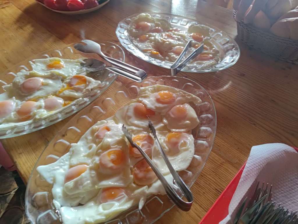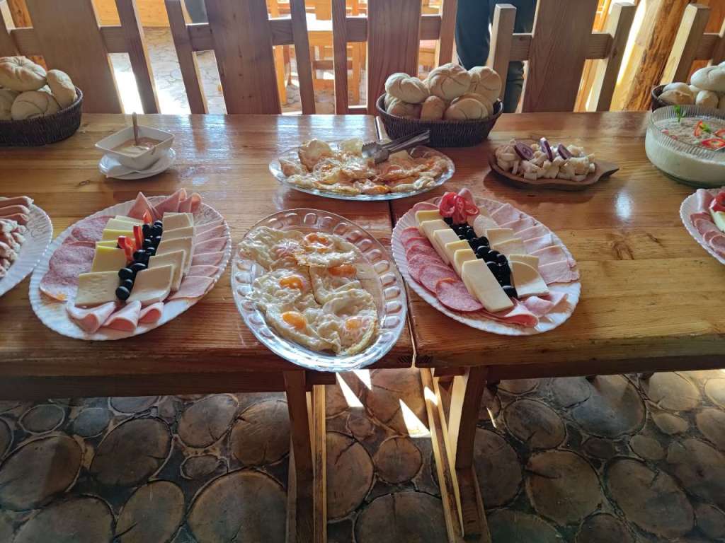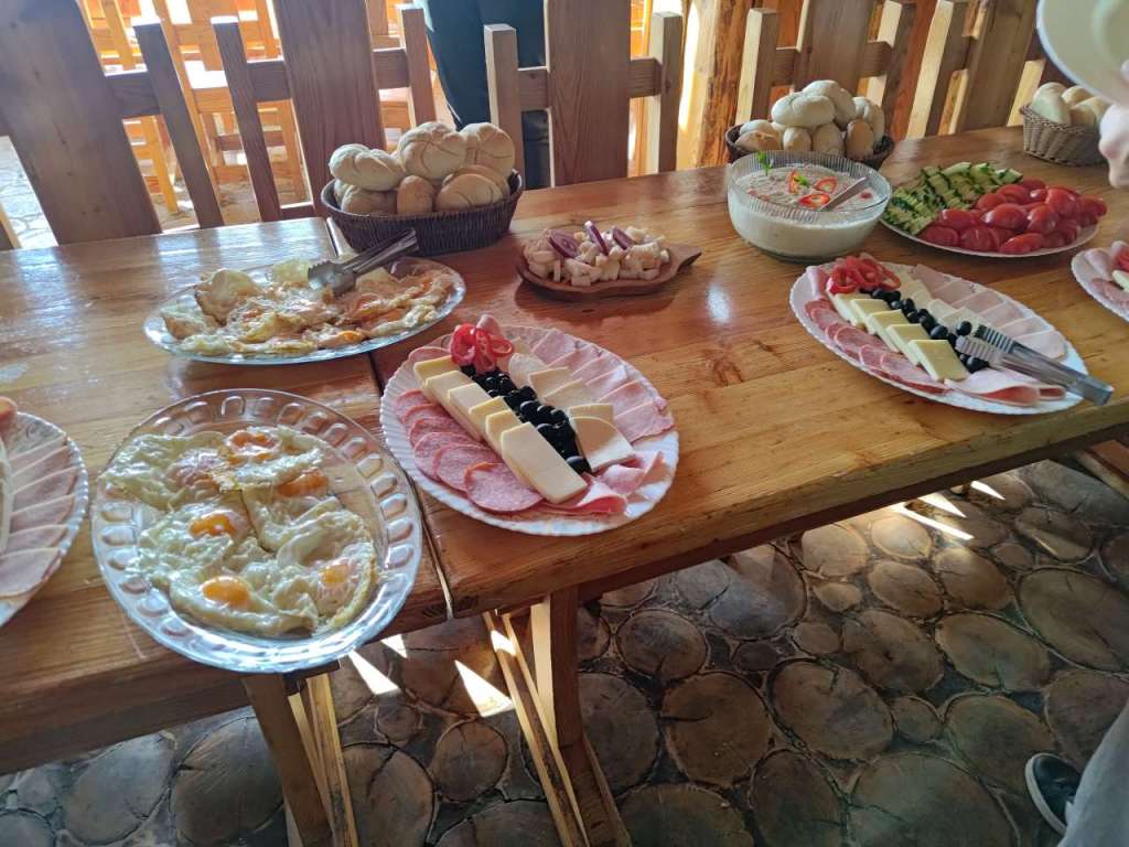 După ce am înghețat vreo 60 de minute pe lângă telefonul care făcea un videoclip timelapse, am mers la micul dejun. Bufet suedez, copios, cu de toate – brânză, cașcaval, ouă prăjite, omletă, mezeluri, fasolică bătută, brânză de burduf, zacuscă și altele. Asezonat cu o cafea și cu un ceai cald de fructe de pădure. Copios și bun, perfect pentru porția de energie necesară urcării pe traseu.