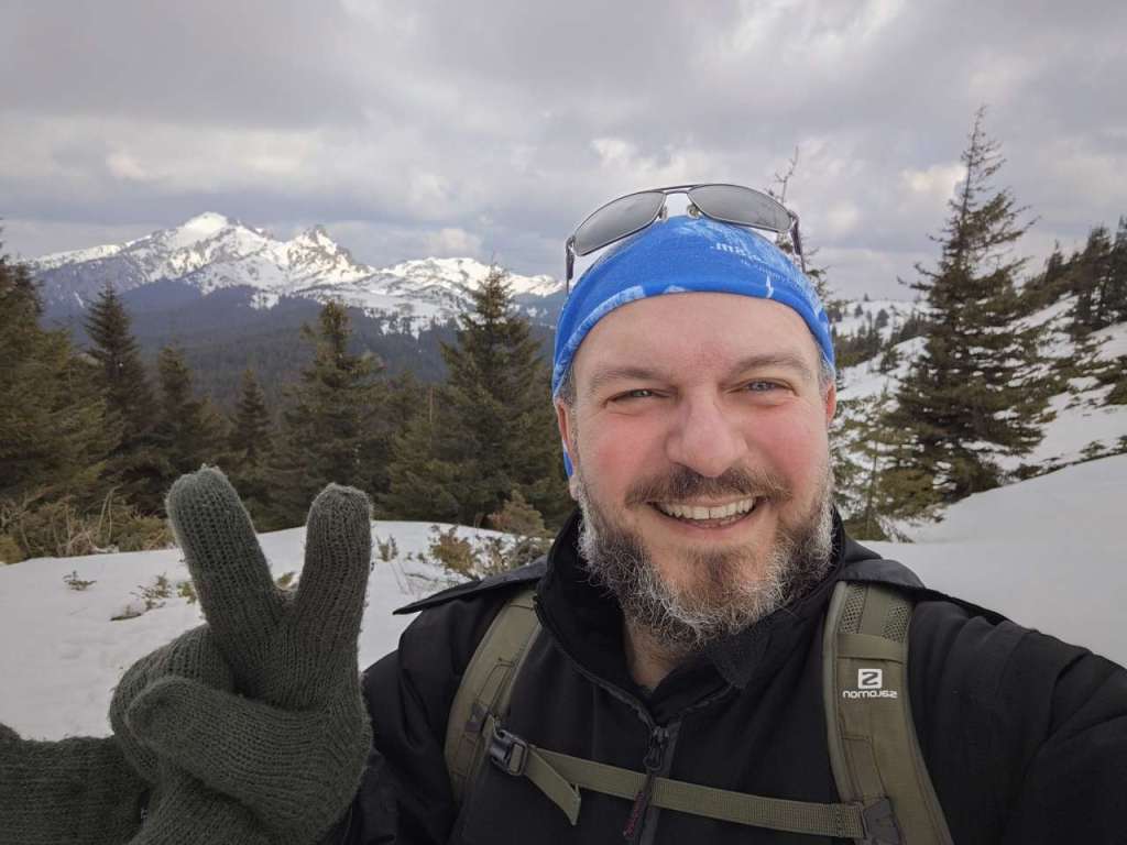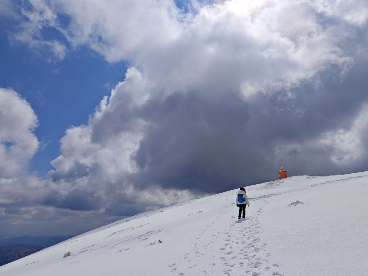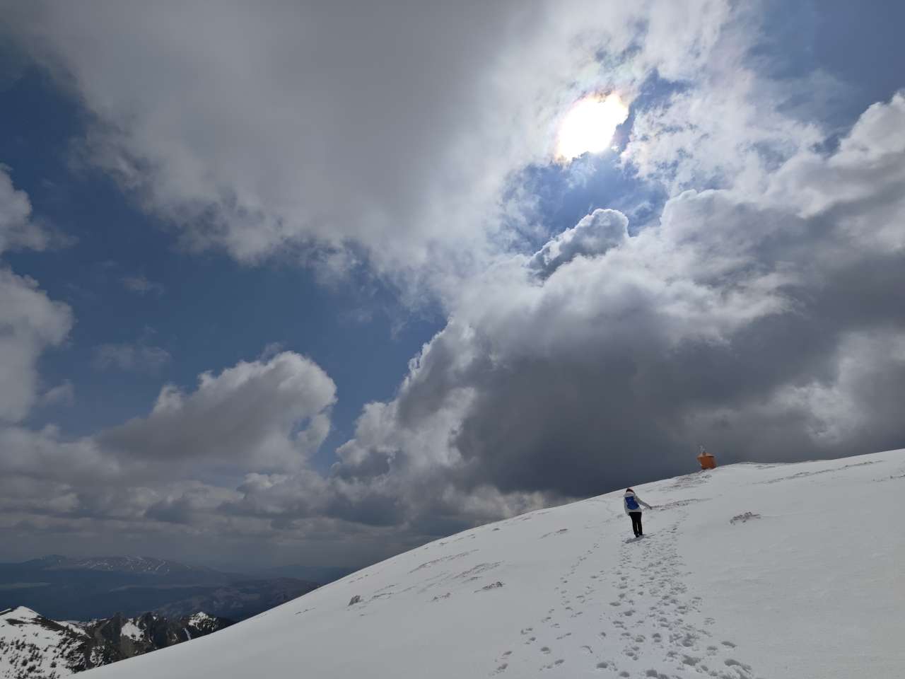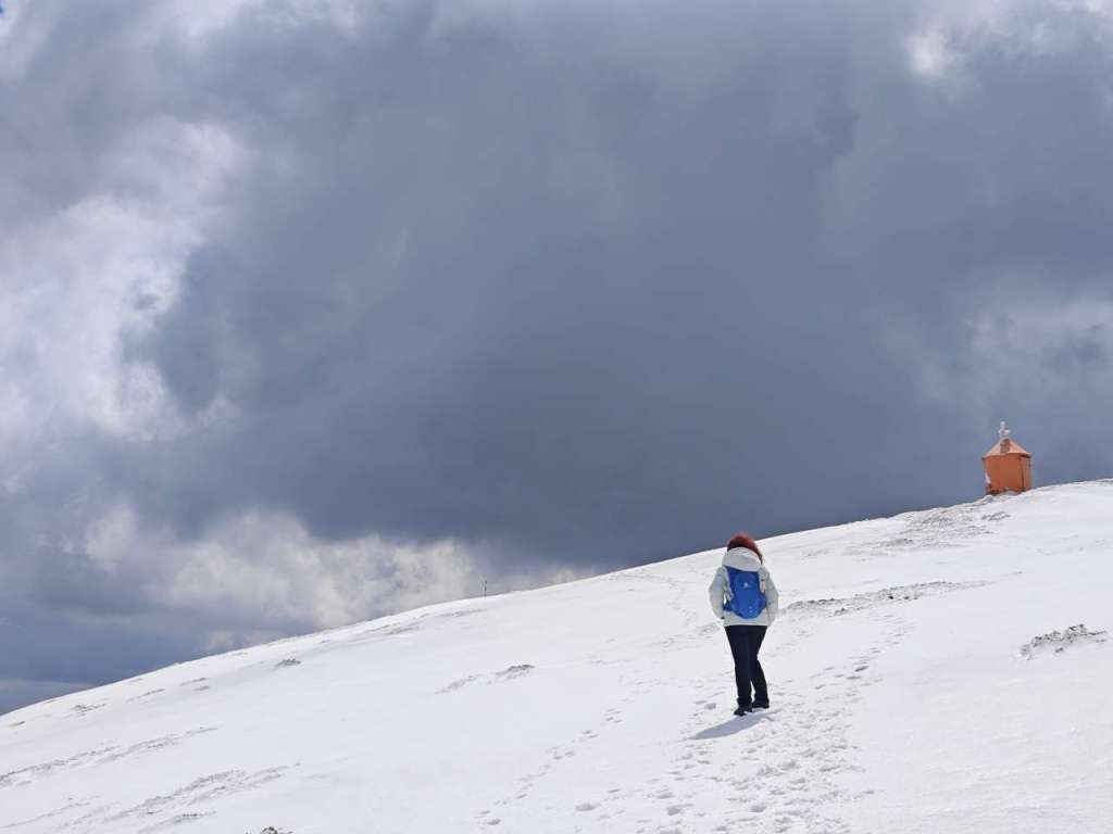 Pas după pas, respiro după respiro, afundat picioarele în zăpadă, scos picioarele din zăpadă, pus gluga pe cap că bătea vântul prea tare, scos gluga de pe cap când mi-era prea cald, pus gluga la loc pe chelie în două minute… Și tot așa, după aproape 2 ore și 30 de minute am ajuns lângă stația meteo. Oricum nu-mi permiteam să stau prea mult pe loc, pentru că imediat se răceau piciorușele deja ude…