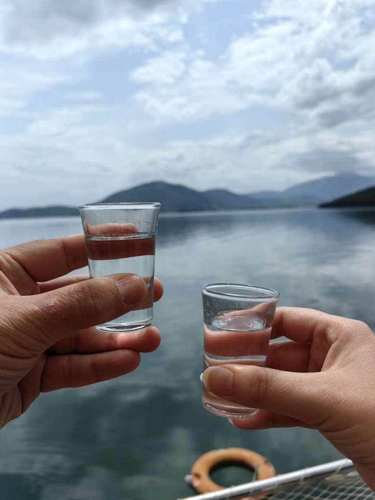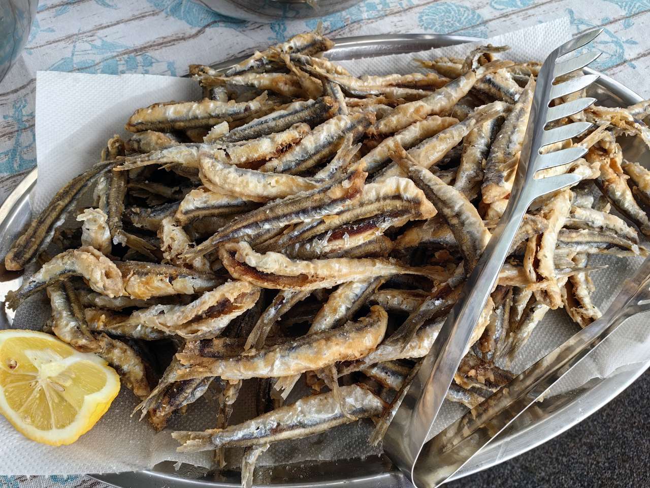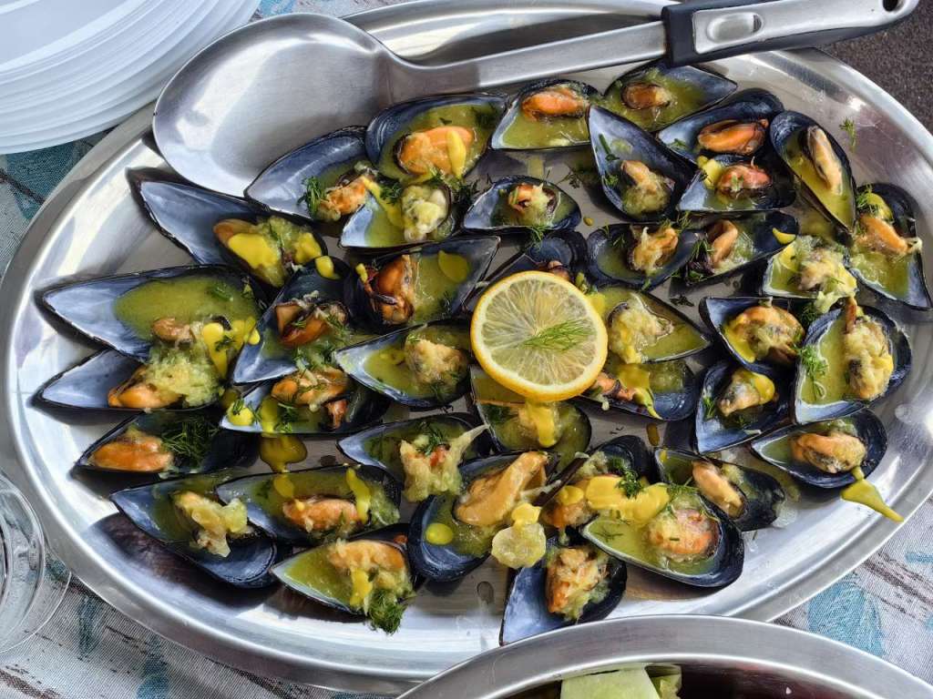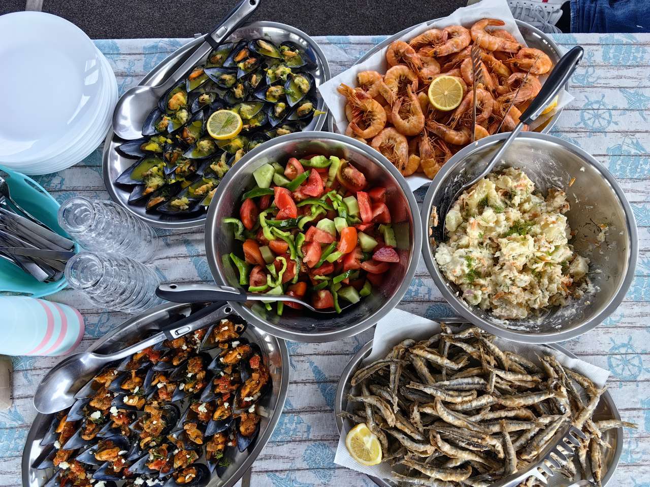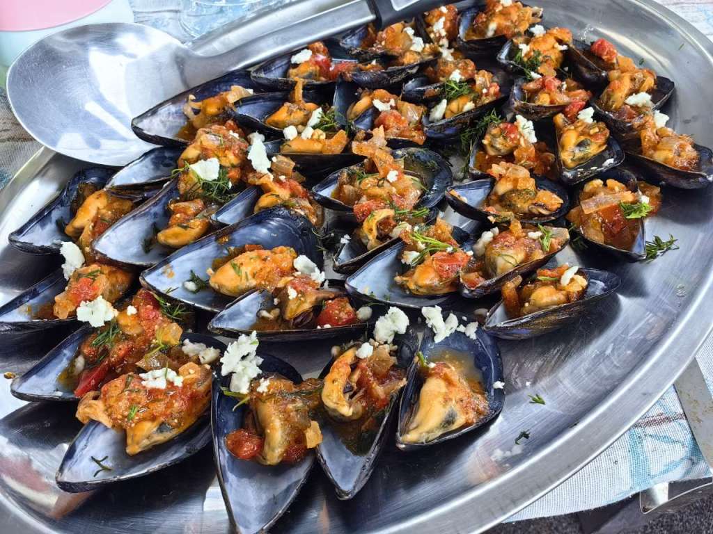 După ce delfinii s-au retras pe cine știe unde, vaporașul s-a oprit într-un golfuleț liniștit, a ancorat iar noi am servit masa – am început cu niște ouzo, un păhărel, ba chiar două, după poftă, vinuleț alb de casă, foarte bun și acesta, apoi masa s-a ticsit de scoici, după două rețete, de sardine prăjite, hamsiile cele de toate zilele, de vestiții și delicioșii creveți de Amvrakikos, niște sălățică grecească dar și o salată orientală.
