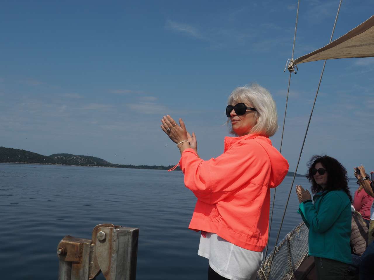 Dimitris ne-a spus că delfinilor le place muzica dar și câ sunt tare activi când bătem din palme. Trucuri de altfel pentru a-i face mai curioși și să se apropie de vaporaș. Așa că, pentru următoarele 3 ore, toată lumea a bătut frenetic din palme până s-au plictisit și delfinii de noi.
