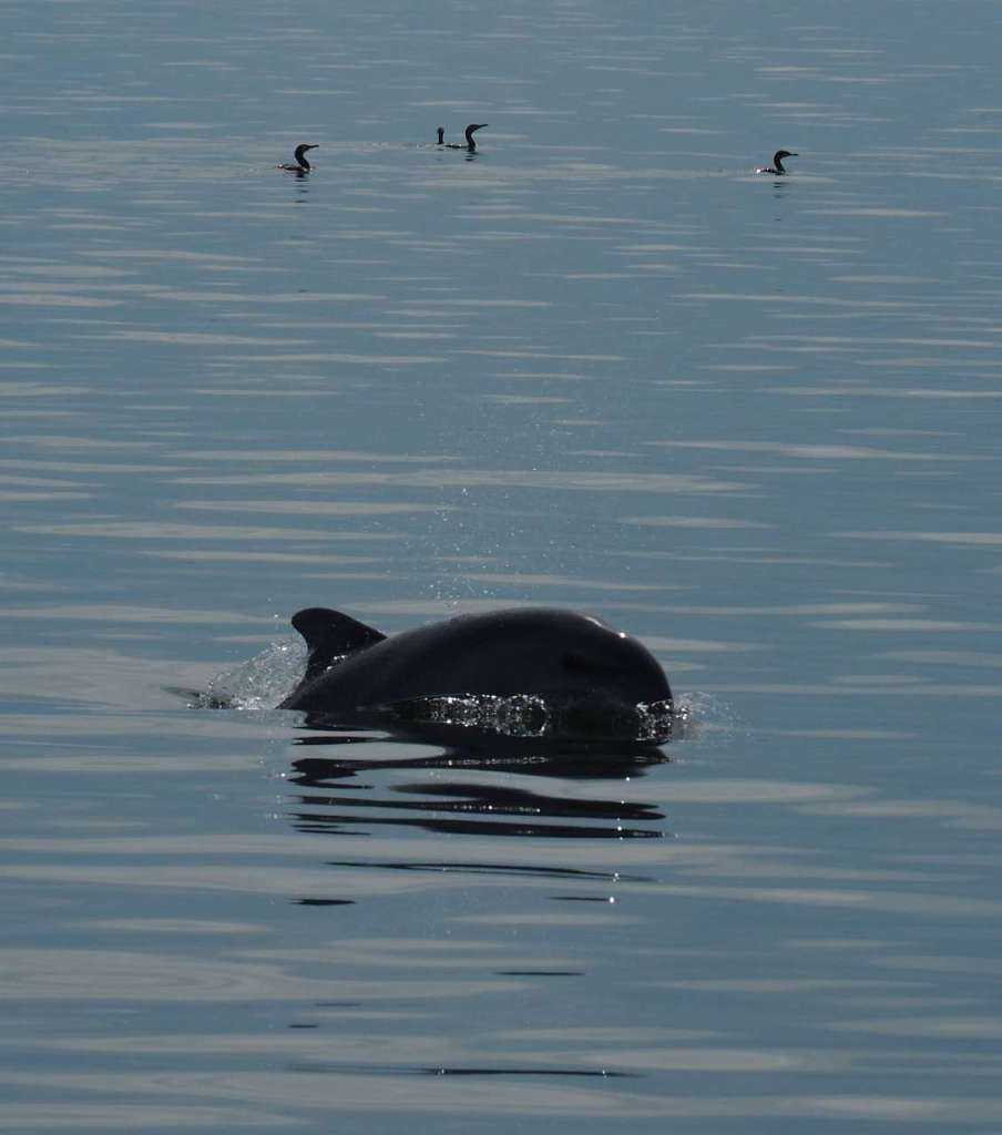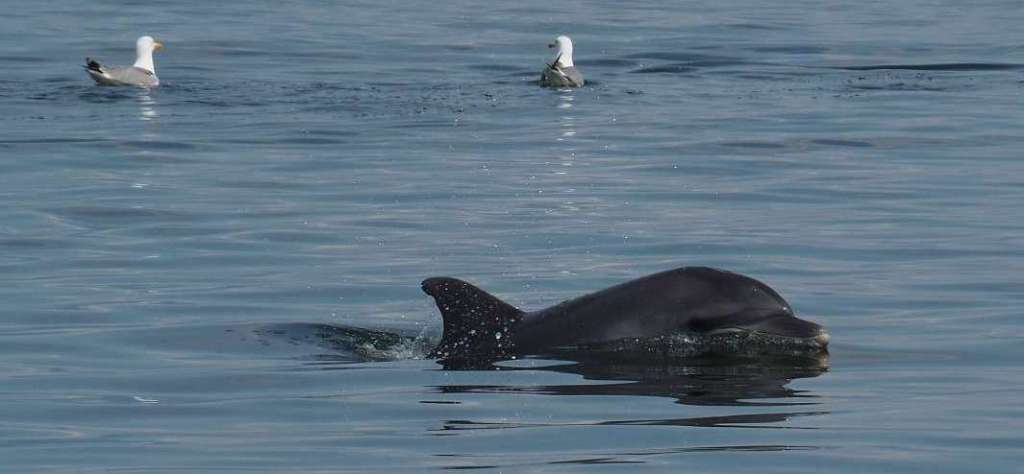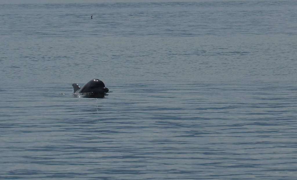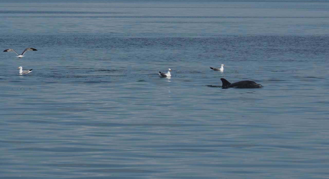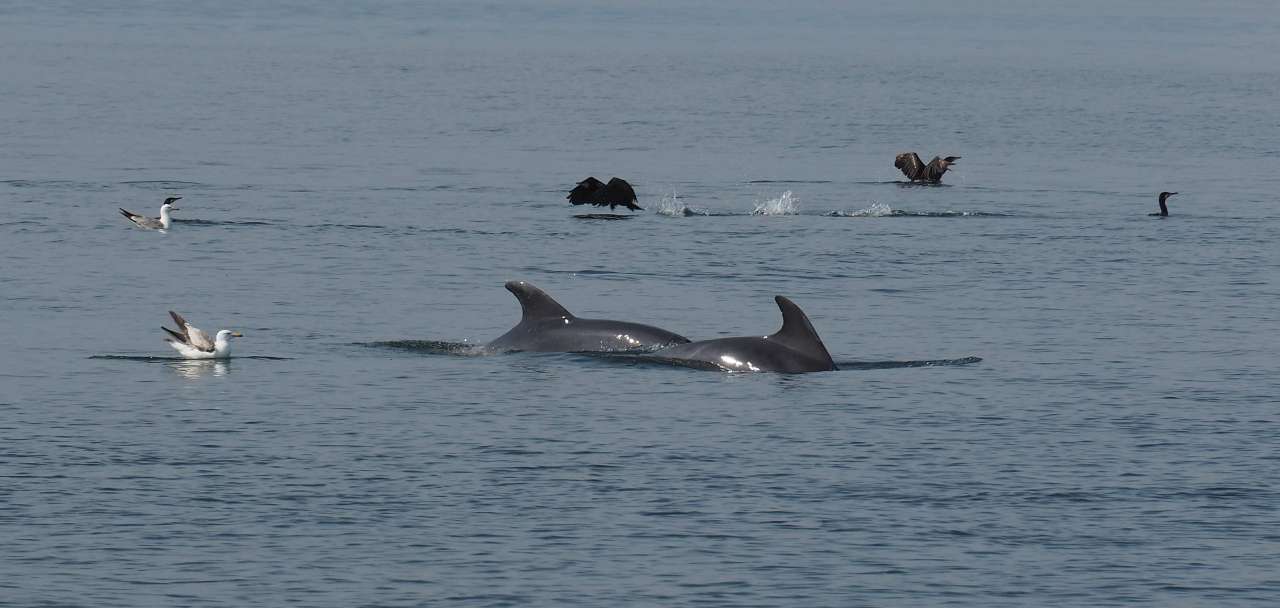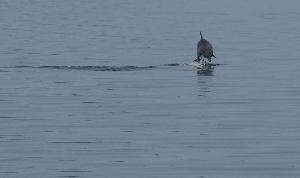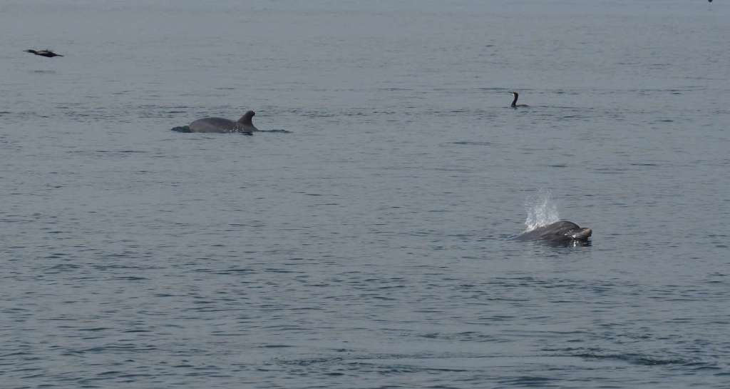 Păsăret gârlă, delfini din abundență, grațioși, ba mai departe, ba trecând pe sub chila vaporașului, ca să se lase priviți doar pentru câteva secunde în apele limpezi, nu destul pentru a-i poza atât de aproape, un spectacol miraculos care ne-a umplut de emoție.