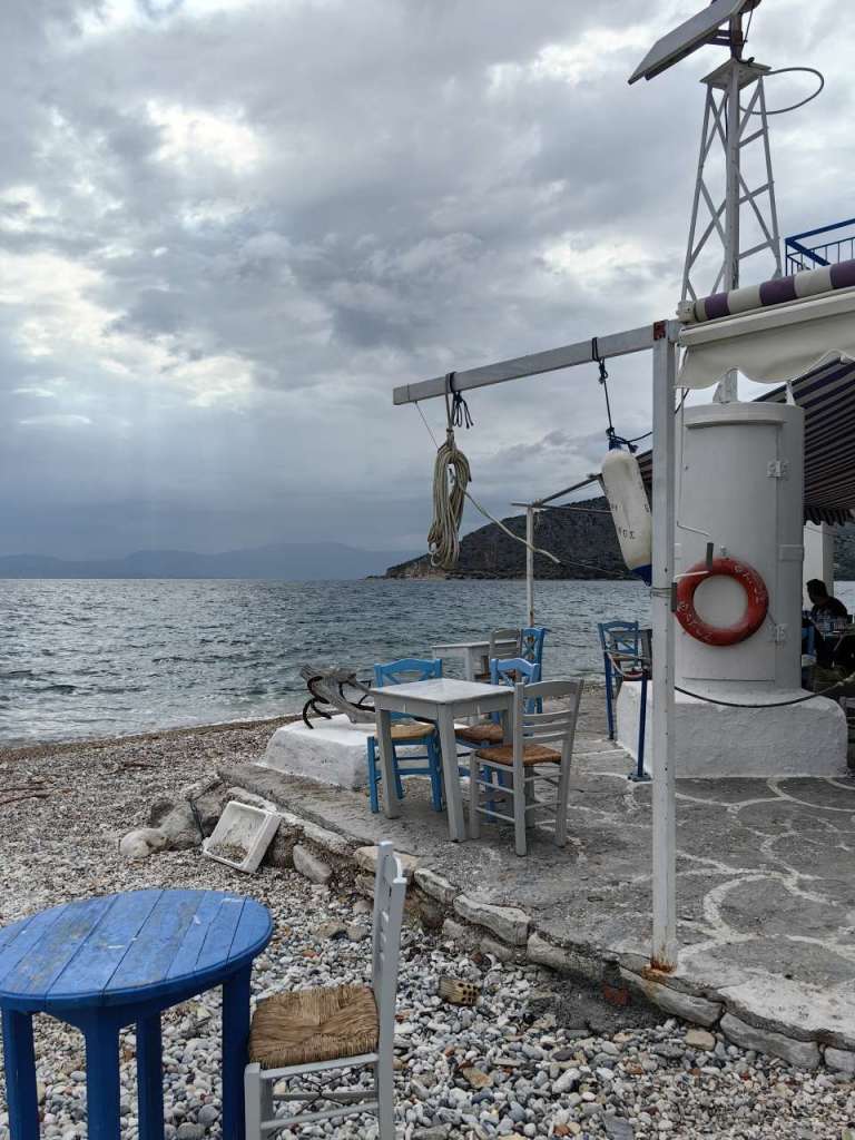 Și am ajuns acolo, am dat colțul, și am descoperit o mică tavernă cu maxim 10 mese, așezate sub streașină sau chiar direct pe malul mării, ce să mai, ca-n filme. Mâncarea delicioasă, bakalao prăjit (cod alb), salată grecească, legume la cuptor, ca la bunica acasă (doar că acolo gătesc cu ulei de măsline, nu de floarea soarelui), totul la prețuri chiar rezonabile. Am mâncat pe cinste, așa că recomand această tavernă tuturor pofticioșilor.