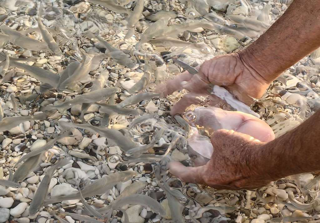 Am asistat cu gurile căscate la acest spectacol culinar grecesc, simplu și natural de altfel. Capul familiei a luat peștele din cutia cu gheață, nu înainte de a clăti tocătorul în apele mării, la doi pași de masă. Apoi a tăiat bucățile de pește, pe care le-a clătit, din nou, în mare. Mi-a și arătat cum mulți alți peștișori veneau și ei să guste din carnea peștelui mai mare.