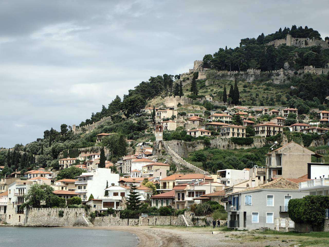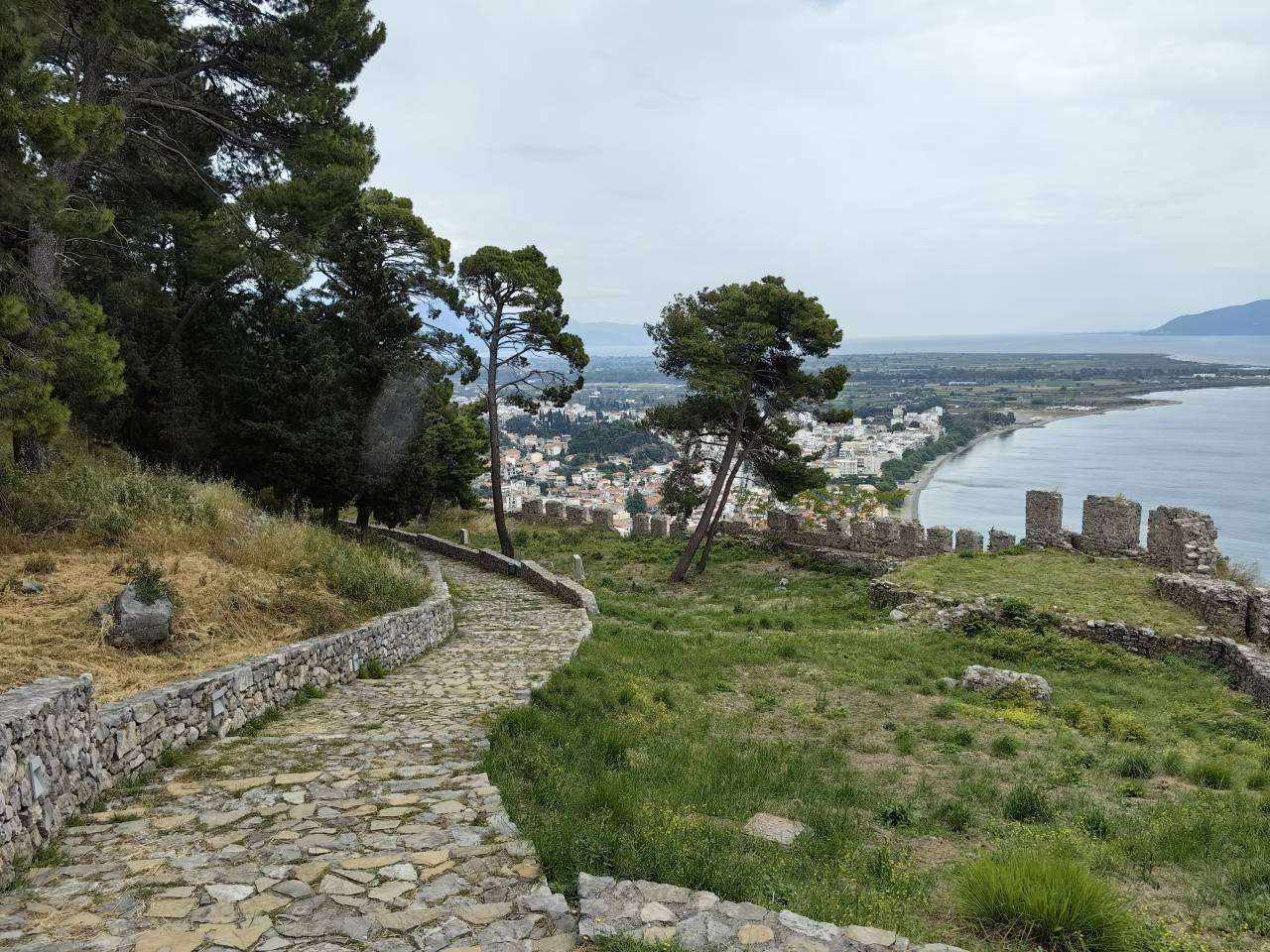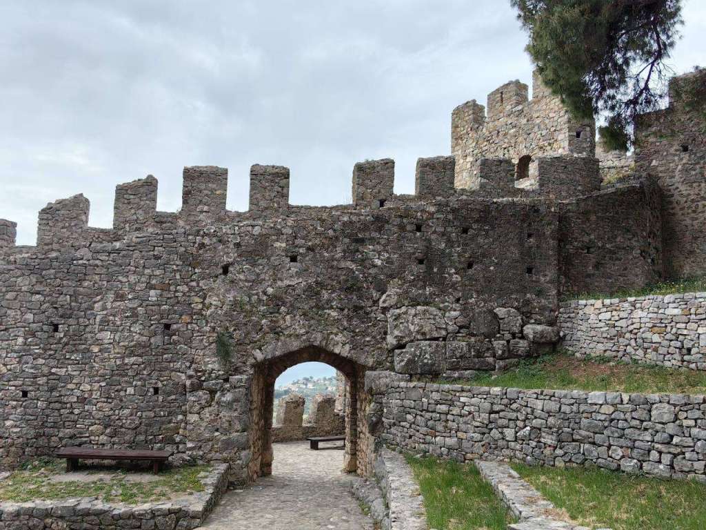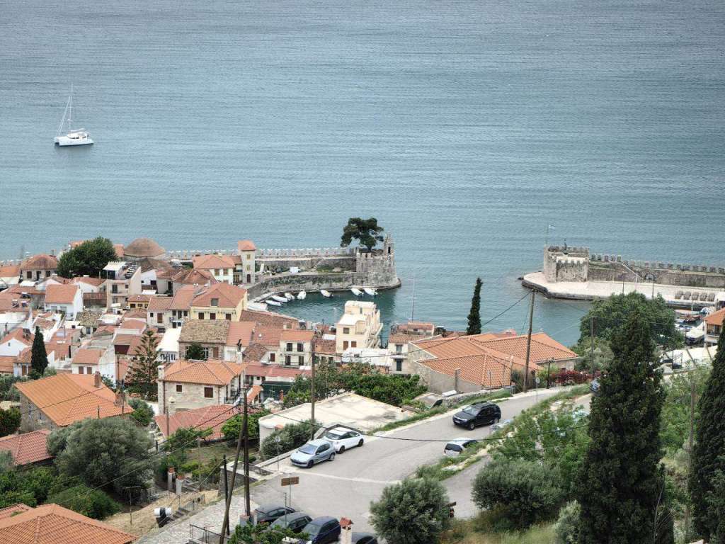 Cetatea venețiană, la fel ca în Parga, tronează de la 200 de metri înălțime, întregul orășel, cu tot cu cetatea de deasupra sa, arătând fix ca într-o ilustrată când este privit de la distanța potrivită. La cetate se poate urca pe jos și am fi făcut-o dacă eram numai noi ăștia mai tinerei dar am folosit mașina care ne-a dus pe o șosea destul de strâmtă și în pantă, așa cum îi place ei și mai ales mie, direct într-o generoasă parcare chiar lângă poarta principală de intrare.