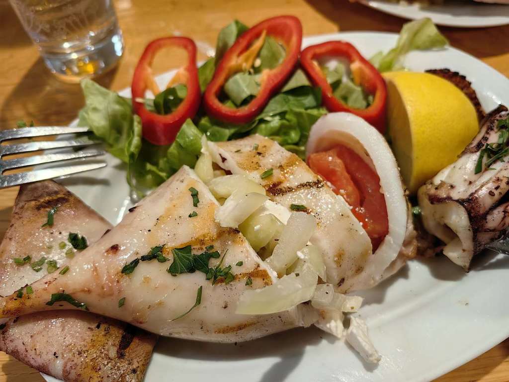 La felurile principale, pornisem de acasă cu mare poftă de calamar umplut cu brânză feta, ca să-mi mai ostoiască măcar un pic dorul de Grecia. Și a fost unul dintre cei mai buni calamari degustați de mine. Măricel, fraged, fără vreun gust marin dubios, umplut atât cu brânză, ardei și roșii. Curcubeu pe cerul gurii, nu alta.