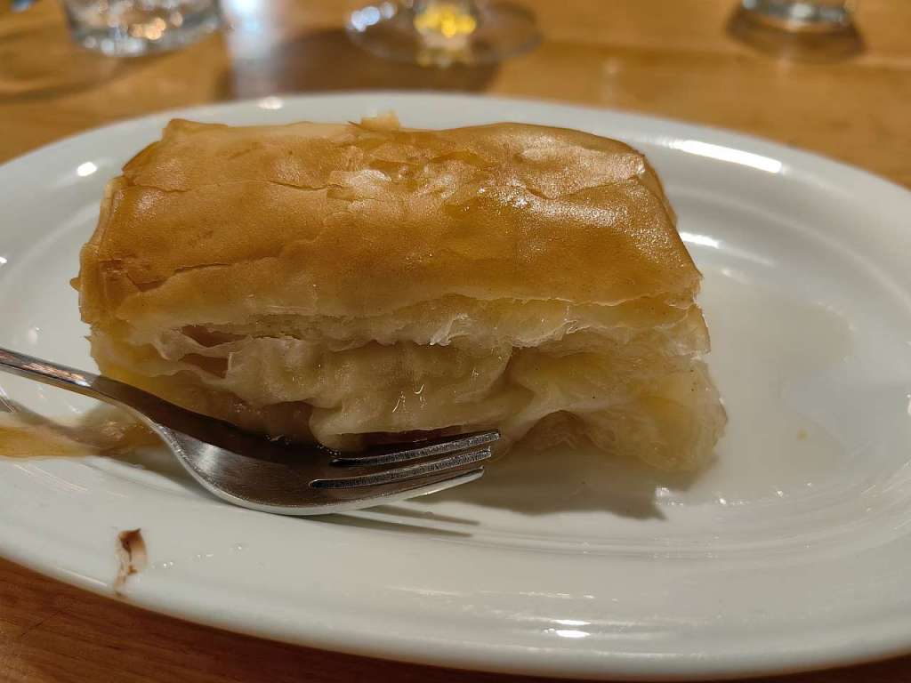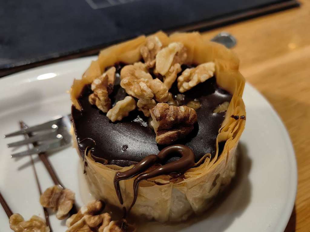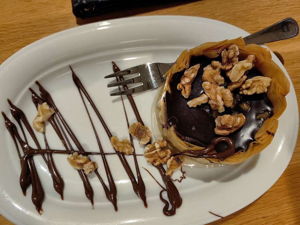Iar la final, pentru că nu mă puteam liniști dacă nu degustam și ceva dulce, am ales un foarte bun galaktoboureko dar și ceva nou pentru mine, karidopita, o prăjitură grecească cu nuci și ciocolată, foarte bune de altfel, ambele.