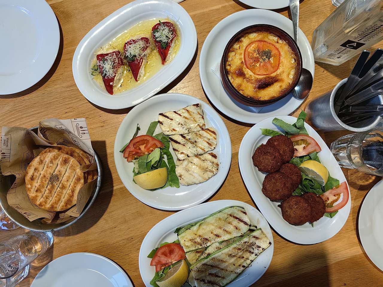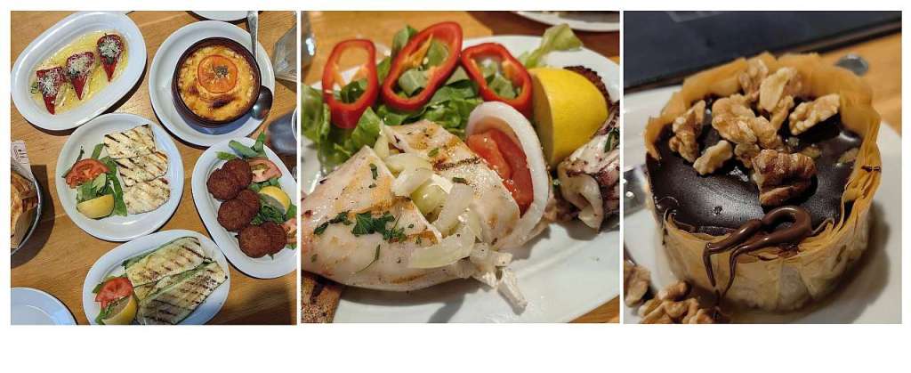 Apoi, am luat la puricat meniul, unul cu poze elocvente pentru a fi sigur de ceea ce comanzi. La aperitive am ales ardei capia umpluți cu brânză feta, chiftele de dovlecei, dovlecei la grătar (la care am comandat și niște mujdei de usturoi, românește cum ne-a zis chelnerul), buiurdi, adică o delicioasă brânză la cuptor, precum și brânză halloumi la grătar.