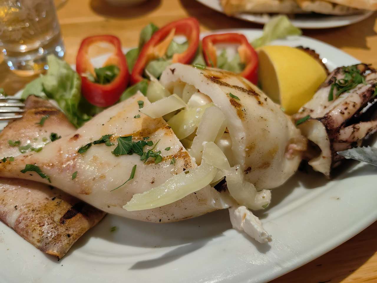 La felurile principale, pornisem de acasă cu mare poftă de calamar umplut cu brânză feta, ca să-mi mai ostoiască măcar un pic dorul de Grecia. Și a fost unul dintre cei mai buni calamari degustați de mine. Măricel, fraged, fără vreun gust marin dubios, umplut atât cu brânză, ardei și roșii. Curcubeu pe cerul gurii, nu alta.