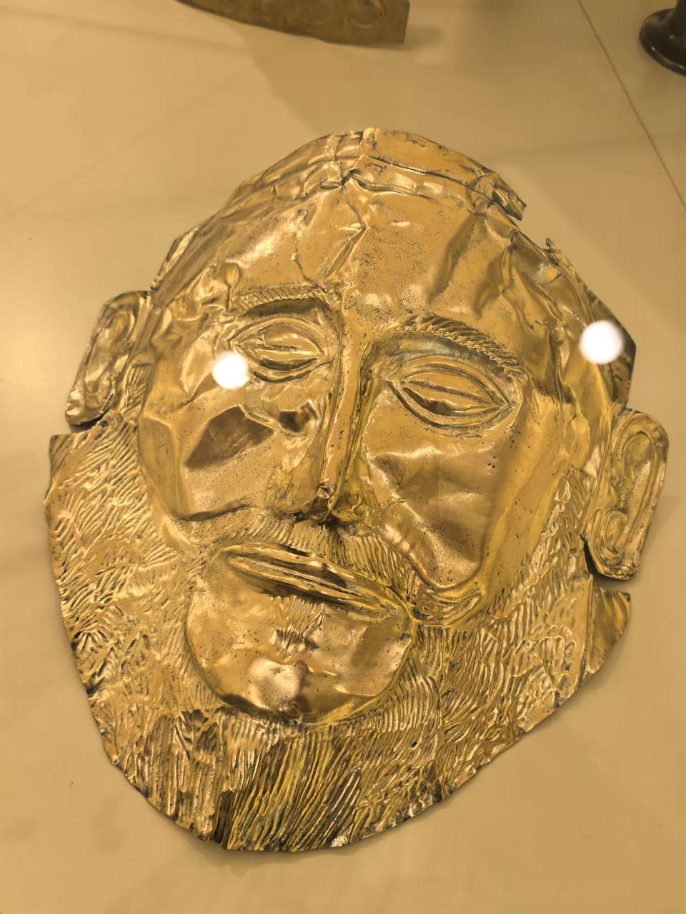 … ba chiar este prezentată și o așa-zisă mască mortuară a lui Agamemnon, de fapt o copie, pentru că originalul și încă patru surate ale sale descoperite aici pot fi admirate acum în muzeul din Atena.