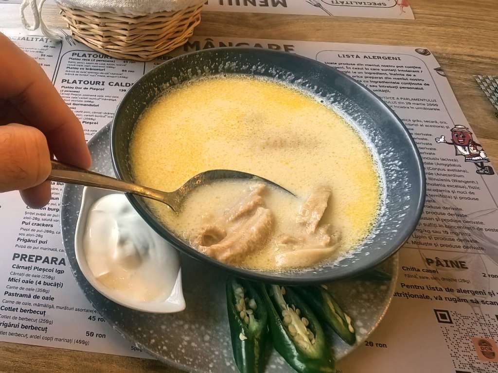 Nu am stat mult și a sosit ciorbița, nu cea mai bună ciorbă de burtă mâncată de mine dar chiar ok, caldă, gustoasă, mi-am făcut pofta. Normal, a venit însoțită de smântână și de ardei iute.