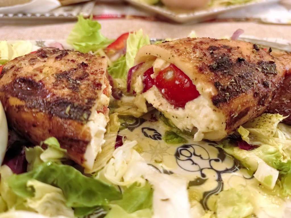 … iar în fața mea, ca prin minune a aterizat un ditamai calamarul la grătar, cum altfel, decât umplut cu feta.