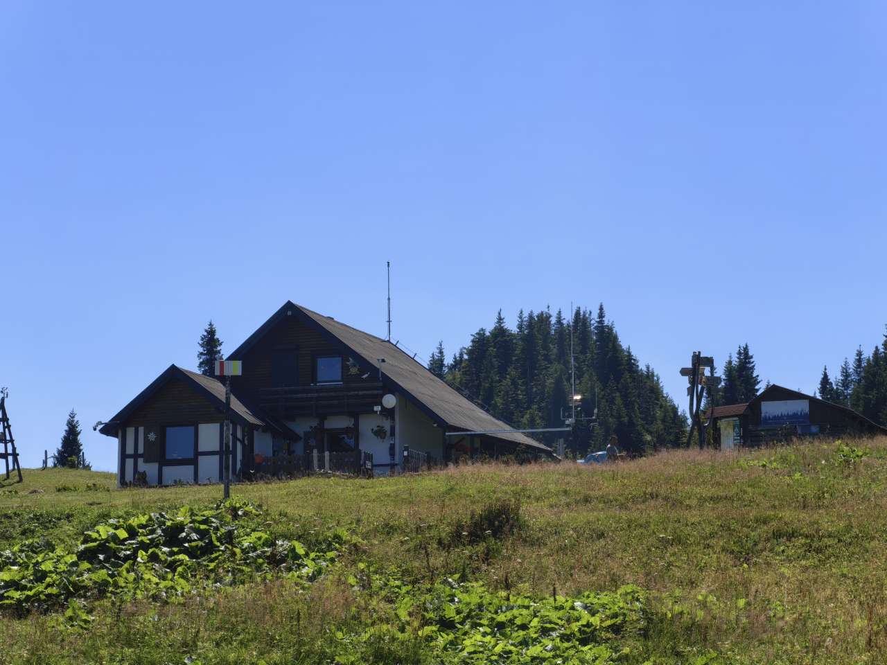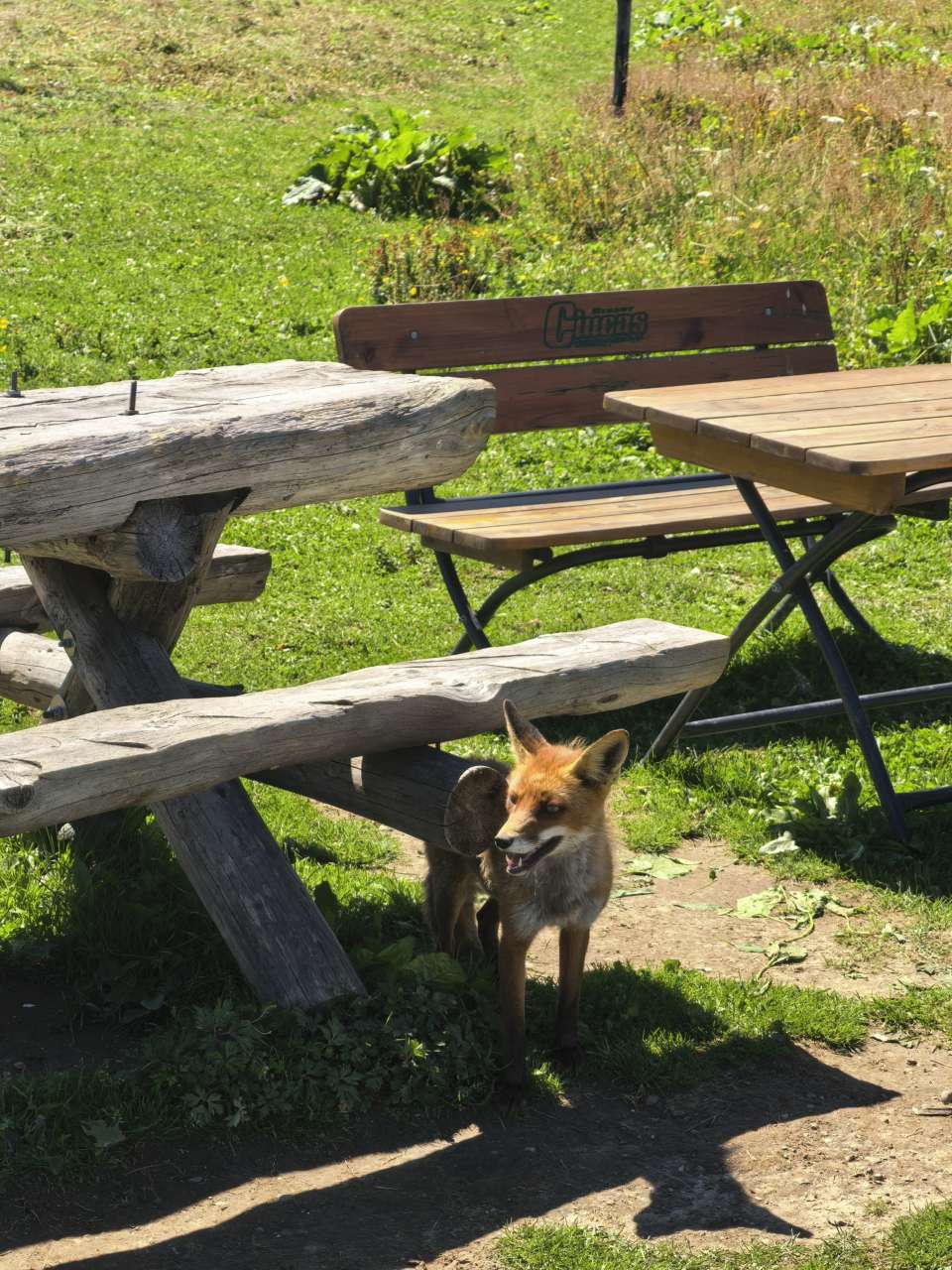 După 4 ore am ajuns la Cabana Piatra Mare, cu o oră întârziere față de indicator. Micuță, cochetă, cu măsuțe amenajate pentru drumeți. Și, surpriză, lângă măsuțe o vulpiță sfioasă, dar nu pe atât de sfioasă încât să se sperie de oameni, aștepta răbdătoare de-ale gurii.