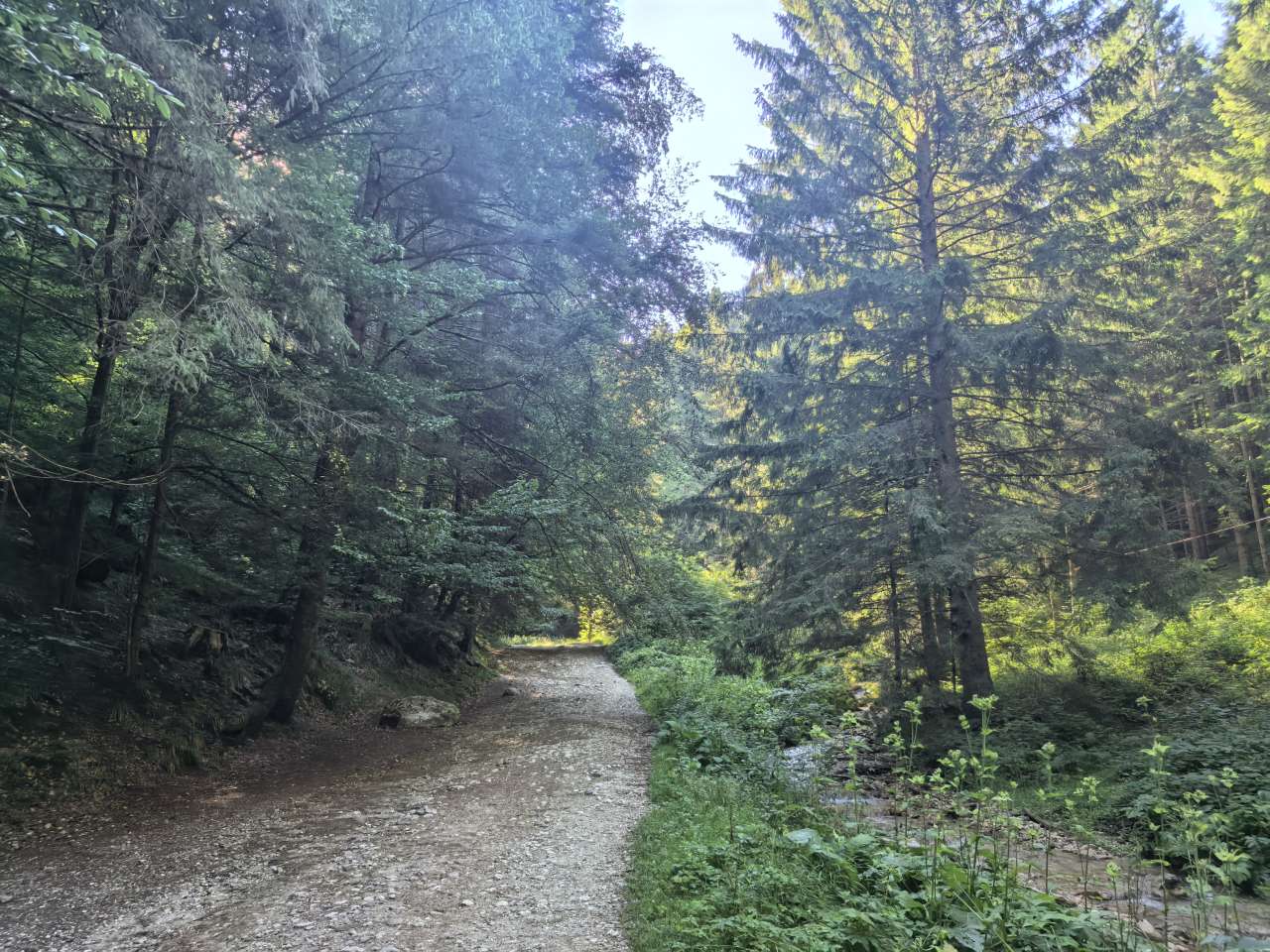 Prima parte a traseului, pe marcaj bandă galbenă, către Canionul 7 Scări, pe un drum forestier, pe alocuri pe o cărare turistică paralelă cu acesta, se urcă ușor în altitudine, ca o plimbare de încălzire. Destul de mulți drumeți, unii chiar străini, majoritatea oprindu-se unde se plătește pentru acces în Canionul 7 Scări sau de unde pleacă tirolienele.