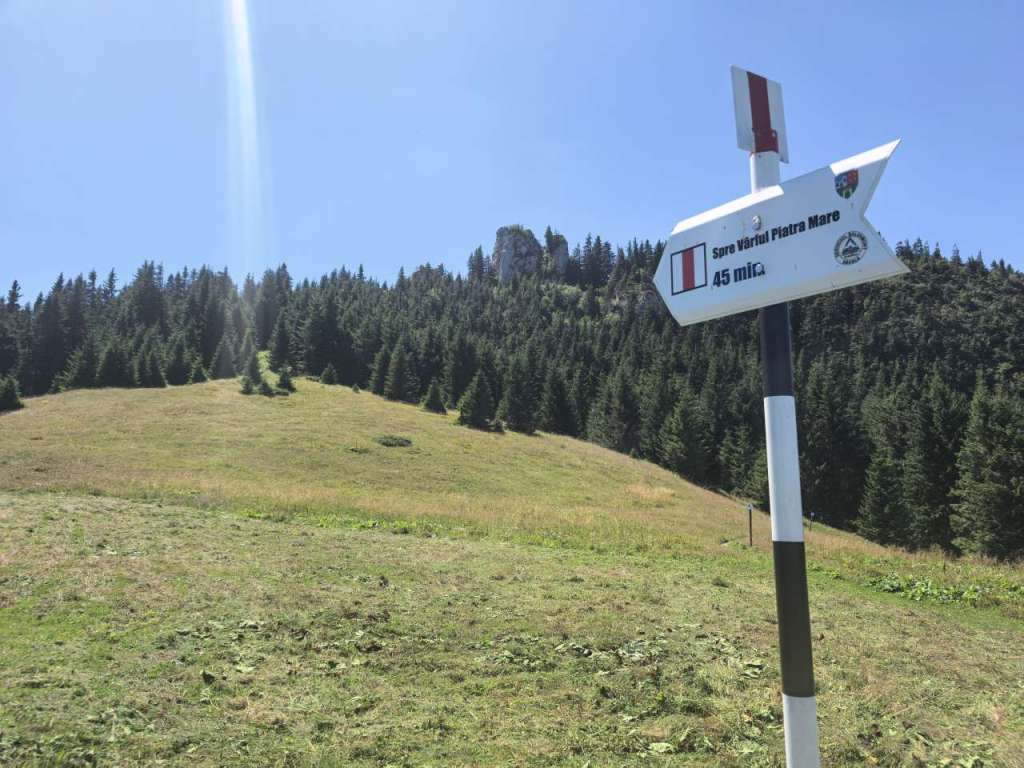 După ce am mai prins oleacă puteri, am îndrăznit să luăm la pas cărarea marcată cu dungă roșie către Vârful Piatra Mare. Indicator, 45 de minute. Nu de alta, dar ar fi fost păcat să nu ajungem și pe vârf, ziua era încă lungă.